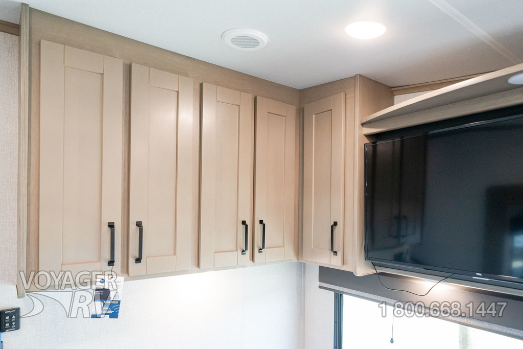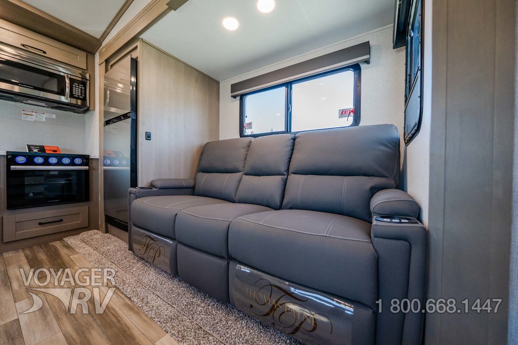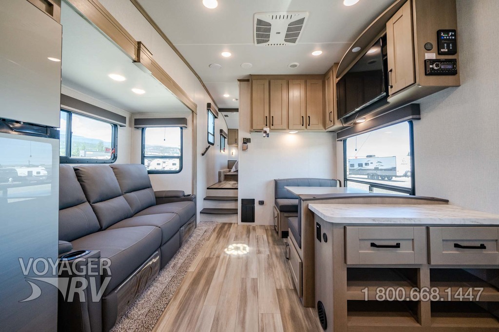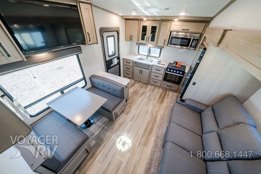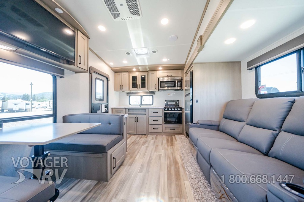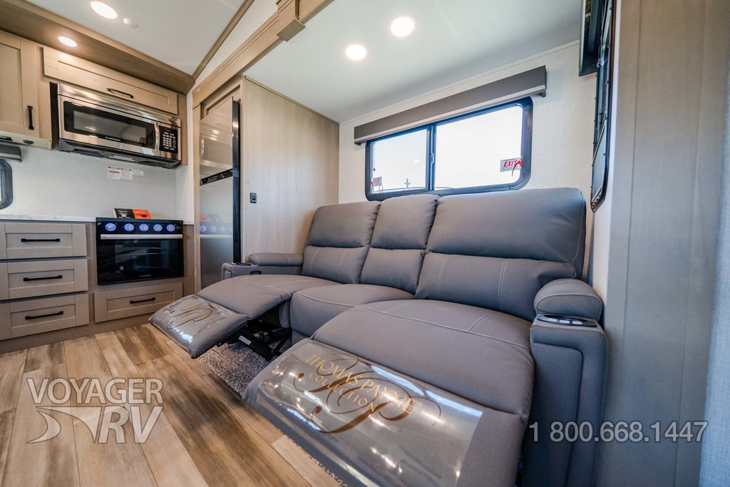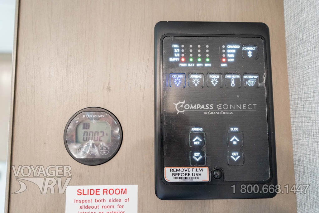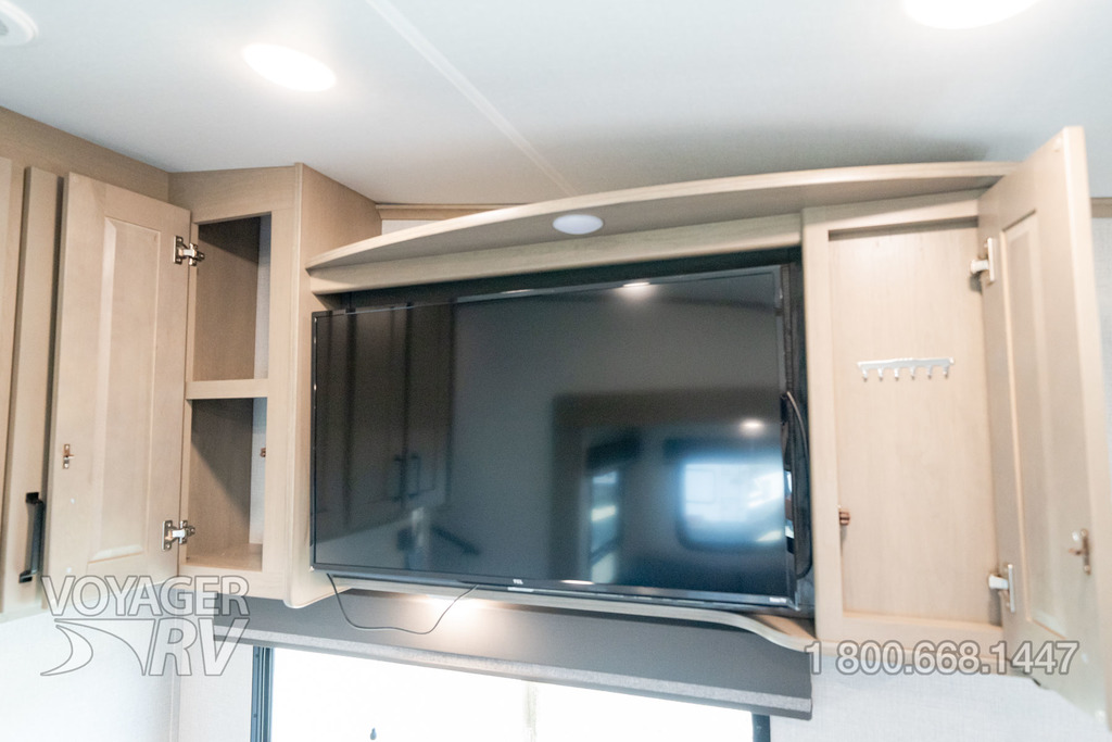- Ultimate Power Package: 30" Stainless Steel Microwave, 15K Ducted Main A/C, "One Touch" Electric LED Awning, Maxx Air Fan, AM/FM/CD/DVD HDMI Bluetooth Stereo, 50 AMP Service, Wired & Framed for 2nd A/C, Hi Definition LED TV, Detachable Power Cord w/LED Light, One Touch Automatic Leveling System, LED Interior Lighting, Motion Sensor Entry Lighting (LED), Compass Connect, Tire Linc TPMS.