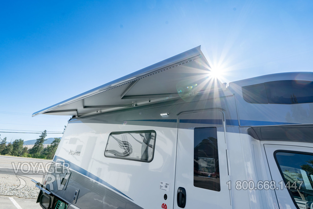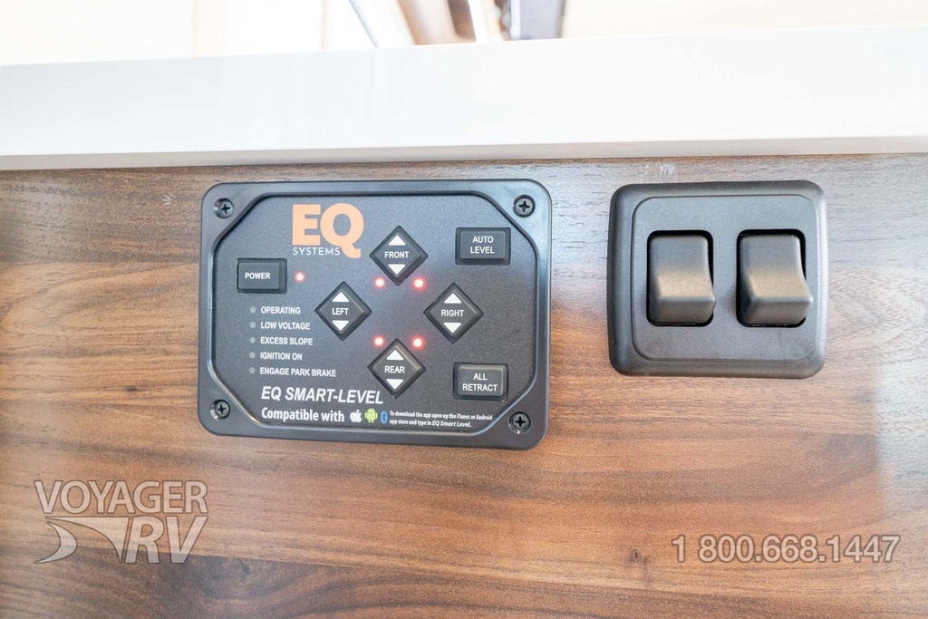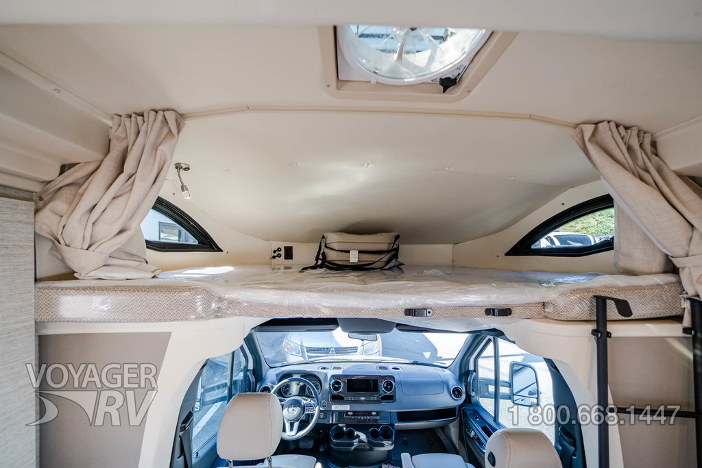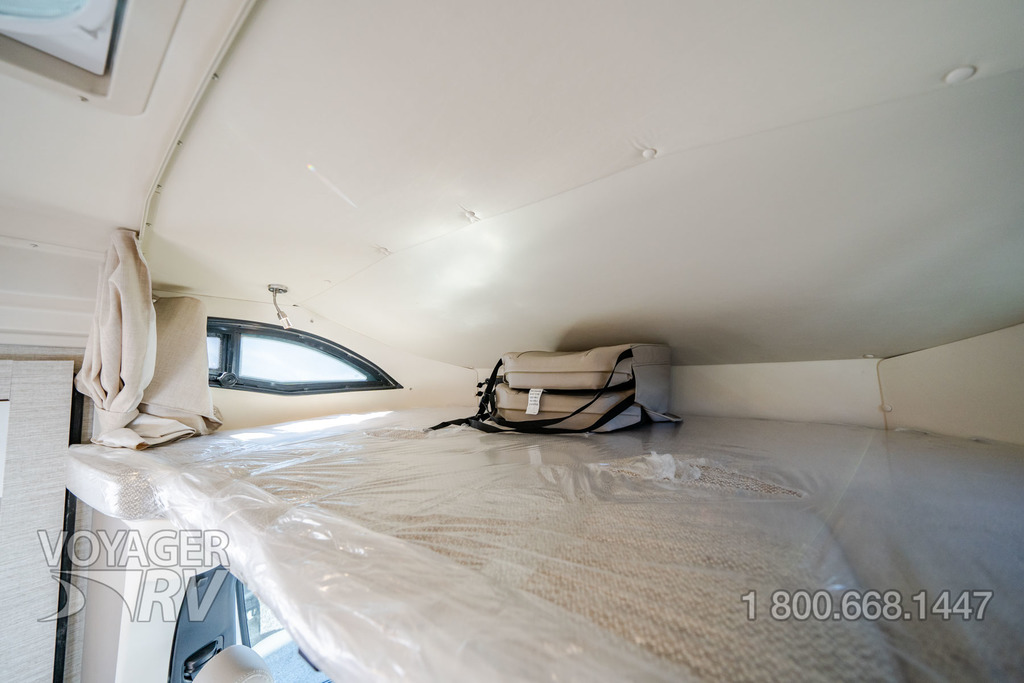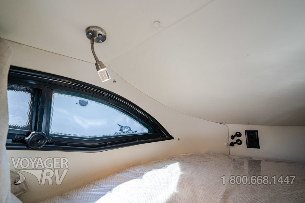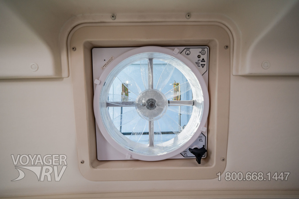 - Powered roof vent — rain cover, electric lift, remote control, thermostat operation (front bunk)