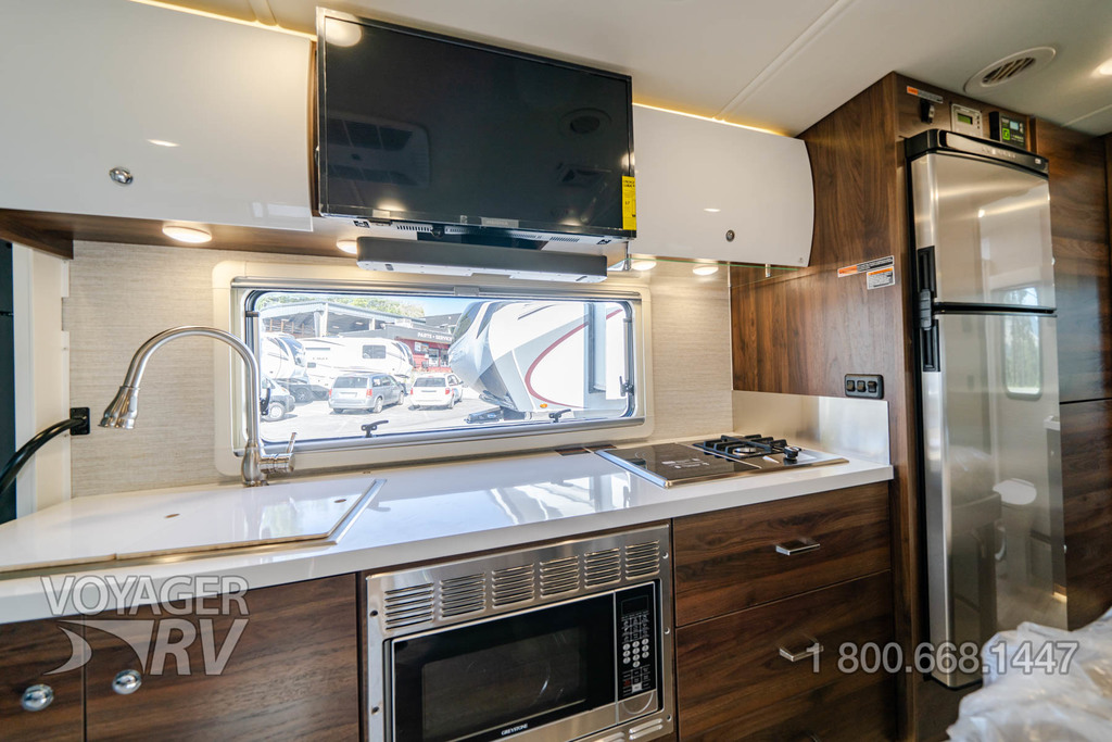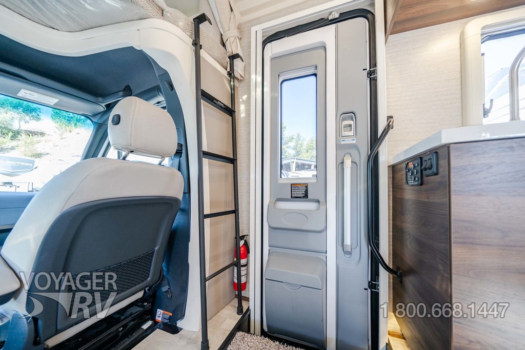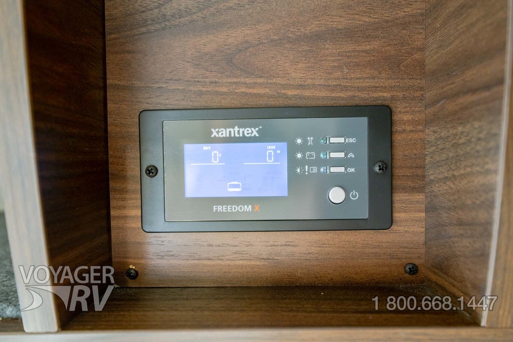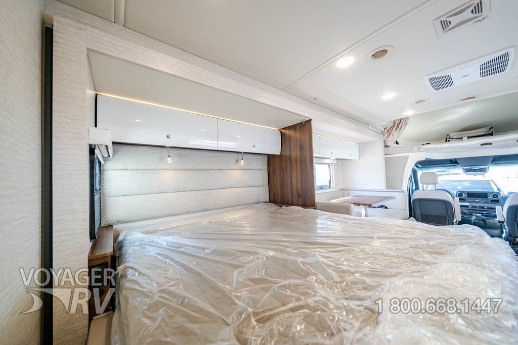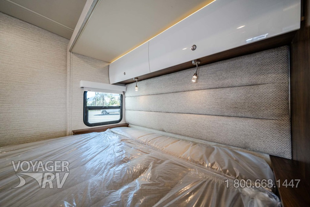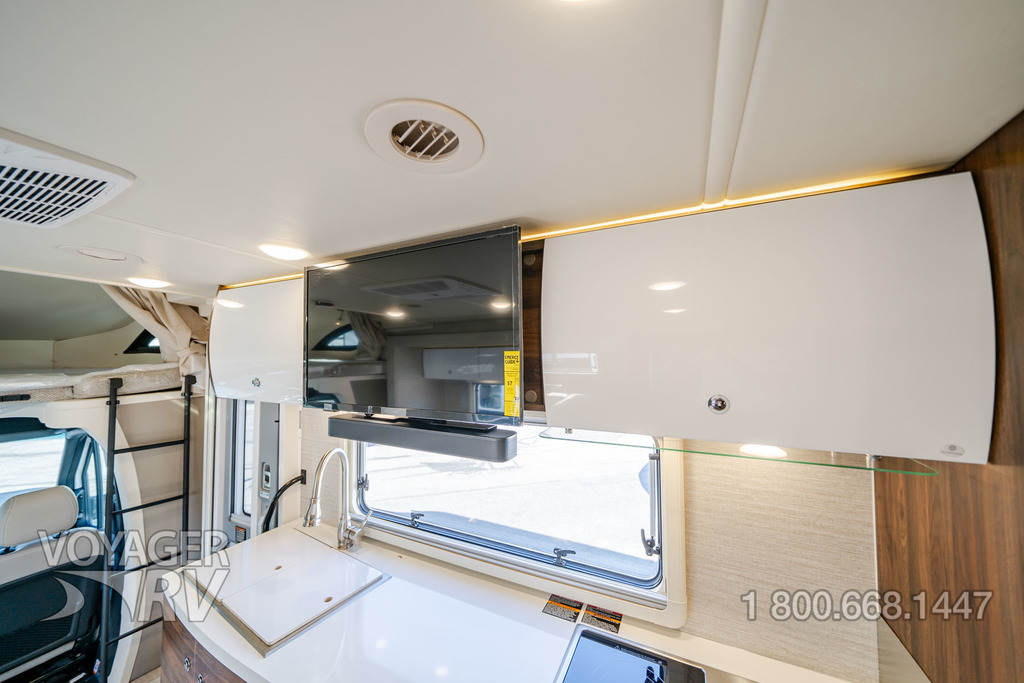 - Powered roof vent — rain cover, electric lift, remote control, thermostat operation (front bunk)