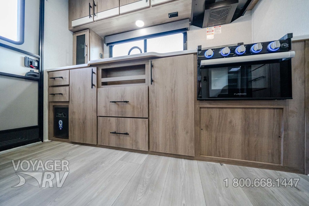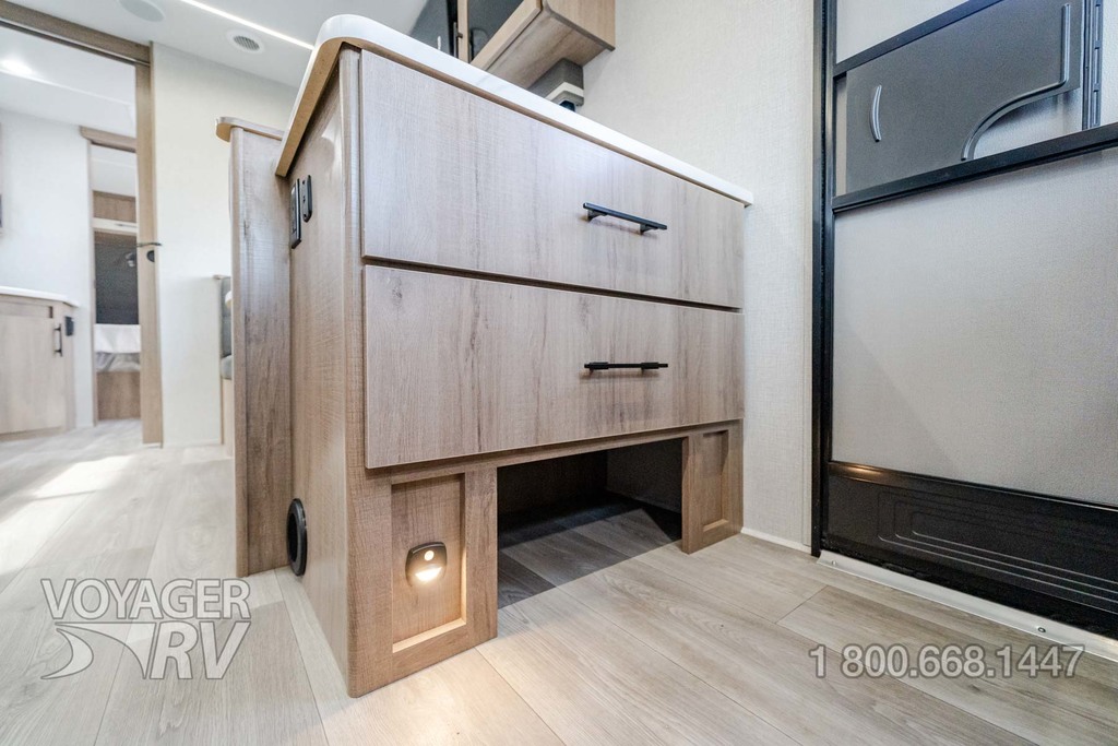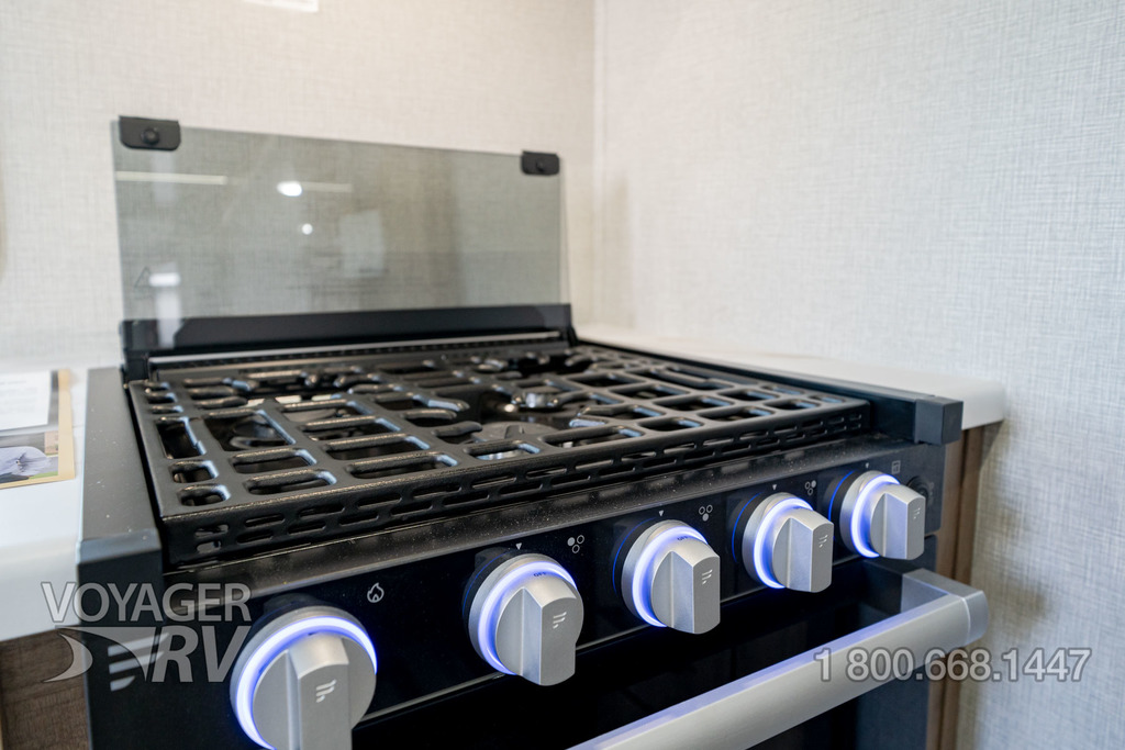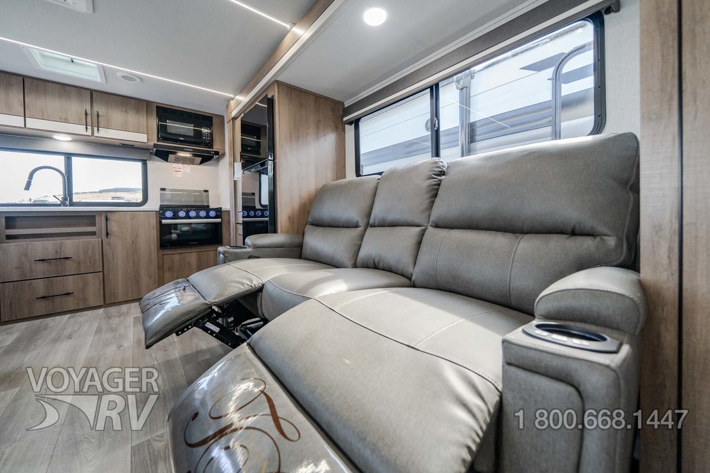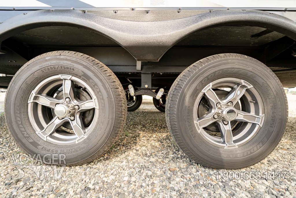 - Peace of Mind Package: Aluminum Entry Steps, Universal Docking Station, ON DEMAND Tankless Water Heater, Black Tank Flush, Spare Tire and Carrier, Nitrogen Filled Radial Tires, Front Rock Guard, Aluminum Rims, Premium Window Treatments, Residential Cabinetry, 6" Break Away Cable, Dedicated Sewer Hose Carrier, Accessory Hitch Reciever, Exterior Cooking Griddle w/ Metal Pullout Drawer, 6' Coiled Break Away Cable, Oversized Holding Tanks, Conventional Microwave.