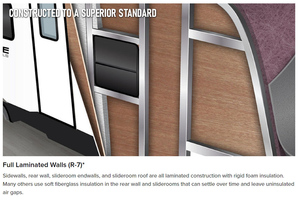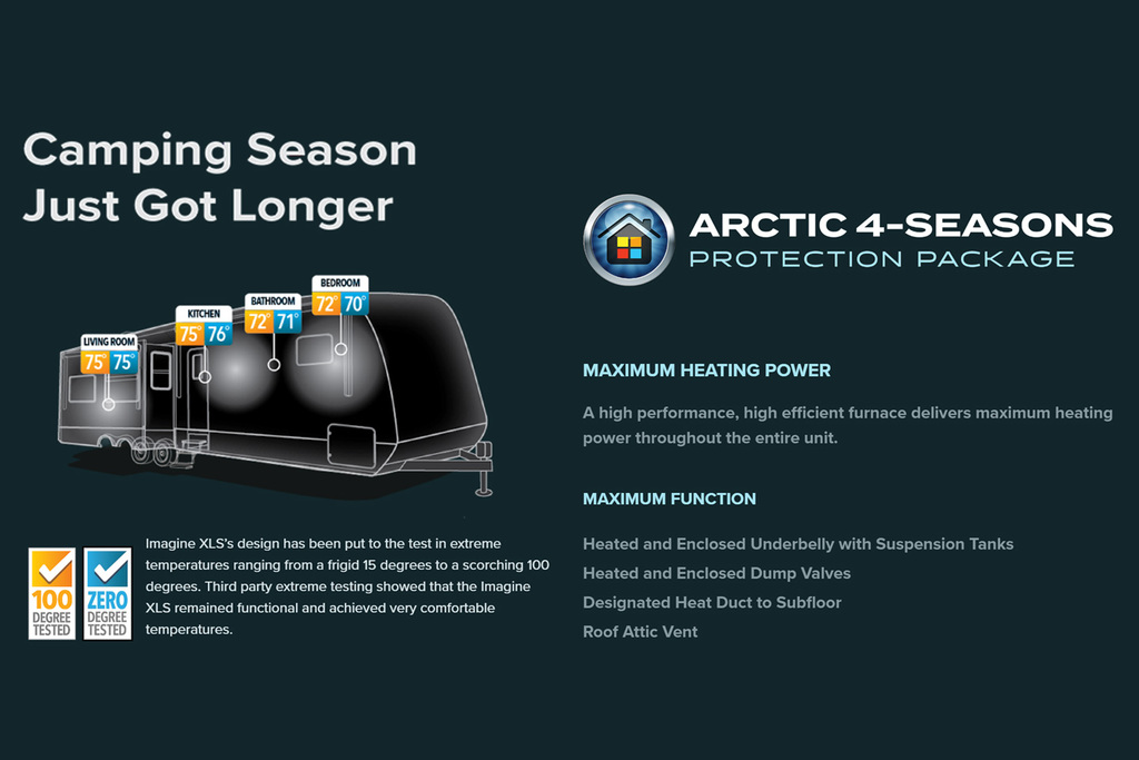 - 4-Seasons Protection Package: 25k BTU High Capacity Furnace, Heated and Enclosed Underbelly with Suspended Tanks, Designated Heat Duct to Subfloor, High Density Roof Insulation with Attic Vent, Moisture Barrier Floor Enclosure, Residential (Ductless) Heating System Throughout, Double Insulated Roof and Front Cap (R-40), Heated and Enclosed Dump Valves.