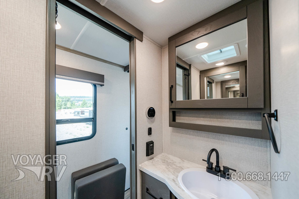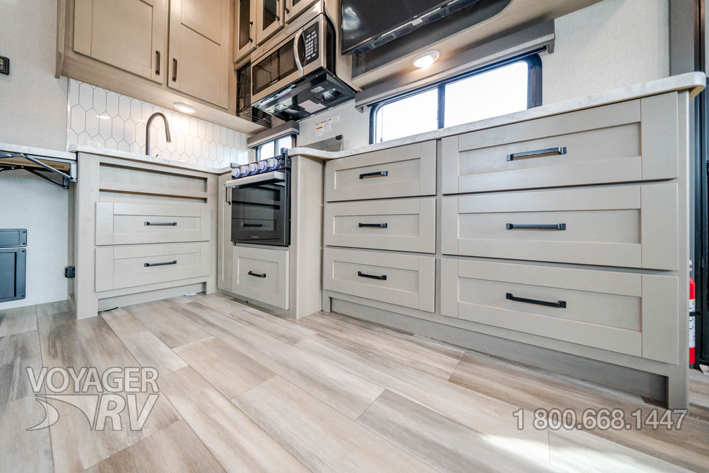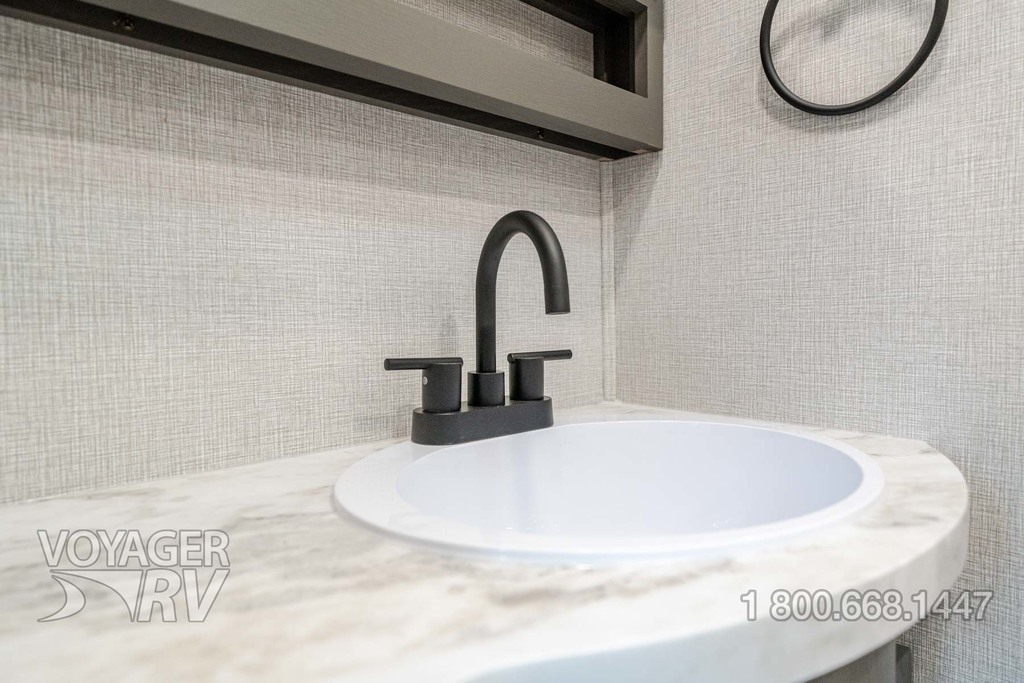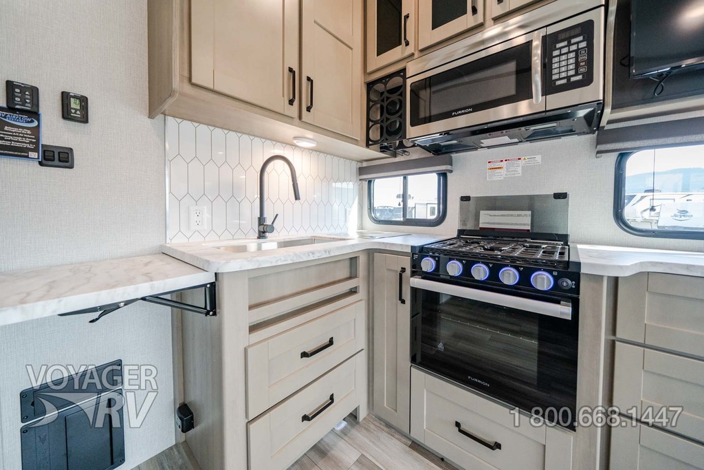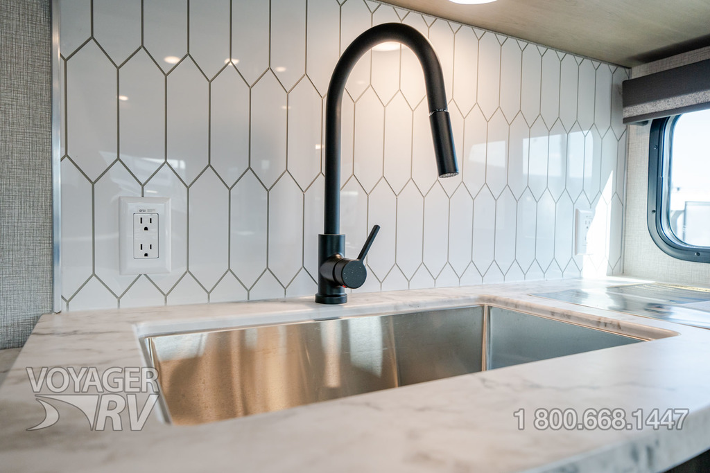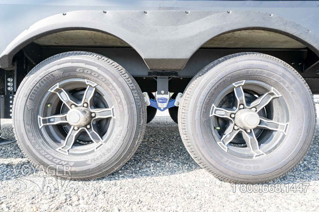 - Peace of Mind Package: Residential Cabinetry, Universal All-In-One Docking Station, Metal Slam Latch Front Cargo Doors, On Demand Water Heater, Porcelain Toilet with Foot Flush, High-Rise Faucet with Pullout Sprayer, Aluminum Entry Steps, Wall Hugger Theatre Seats, Painted Fiberglass Front Cap, Residential Booth Dinette, LP Quick Connect, Self Adjusting Brakes, Roller Shades, 6' Coiled Break Away Cable, Deep Seated Stainless Steel Kitchen Sink, Walk-on Roof, Aluminum Rims, Spare Tire & Carrier, Nitrogen Filled Radial Tires, 2” Receiver Hitch Upgrade, 90 Degree Turn Radius Pin Box (Turning Point)