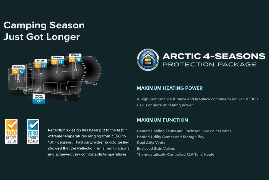 - Arctic 4-Seasons Protection Package: 35k BTU High Capacity Furnace, Double Insulated Roof & Front Cap, Heated & Enclosed Dump Valves, Heated & Enclosed Underbelly w/Circulating Heat, Thermofoil Insulation under Holding Tanks, EZ Winterization Valve in Utility Center, Insulated Slide-out Floors, Dual Attic Vents, 12v Heat Pads on Holding Tanks, Heated Pass Thru Storage Area