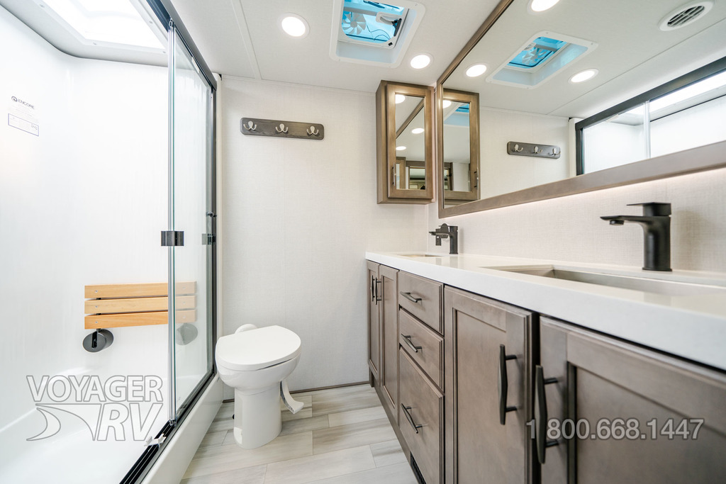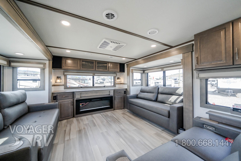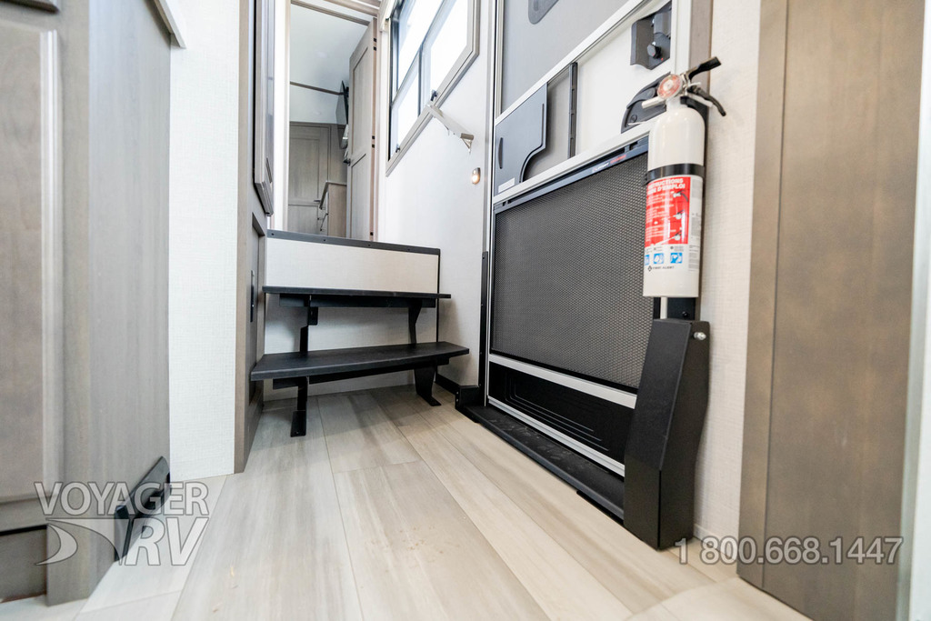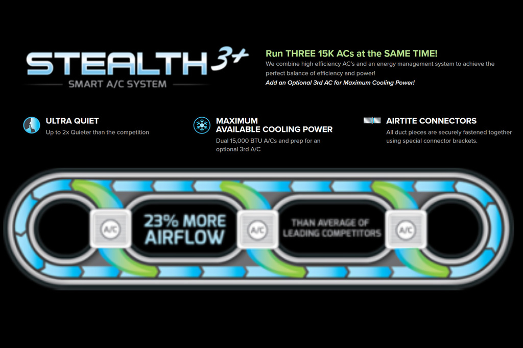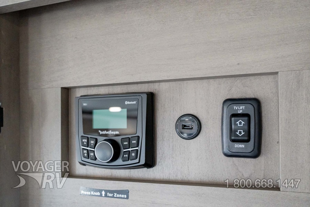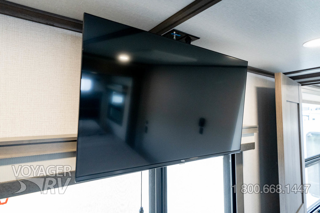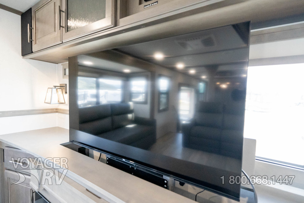 - Residential Living Package: LED Smart TV in Living Area, Rockford Fosgate Stereo Ent. System w/ HDMI and App Controls, Exterior Speakers, Night Stands with USB Ports, Bedside 110-Volt Outlets (2), Keyed Alike, SolidStep Quad Entry Steps, Stealth A/C System, Premium Roller Shades, Hardwood Window Treatments, Congoleum Flooring, Hallway Handrail, Recessed LED Ceiling Lighting, Interior LED Accent Lighting, Hardwood Cabinet Doors, Signature Wall Mounted Dinette Table w/4 Padded Chairs, Theatre Seating, Tri-Fold Hide-A-Bed Sofa, Smoke Detector, LP Alarm, Carbon Monoxide Alarm, Solid Surface Countertops, Smart Sink w/ removeable cutting board, produce strainer and glass rinser.