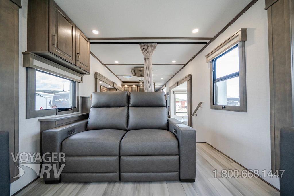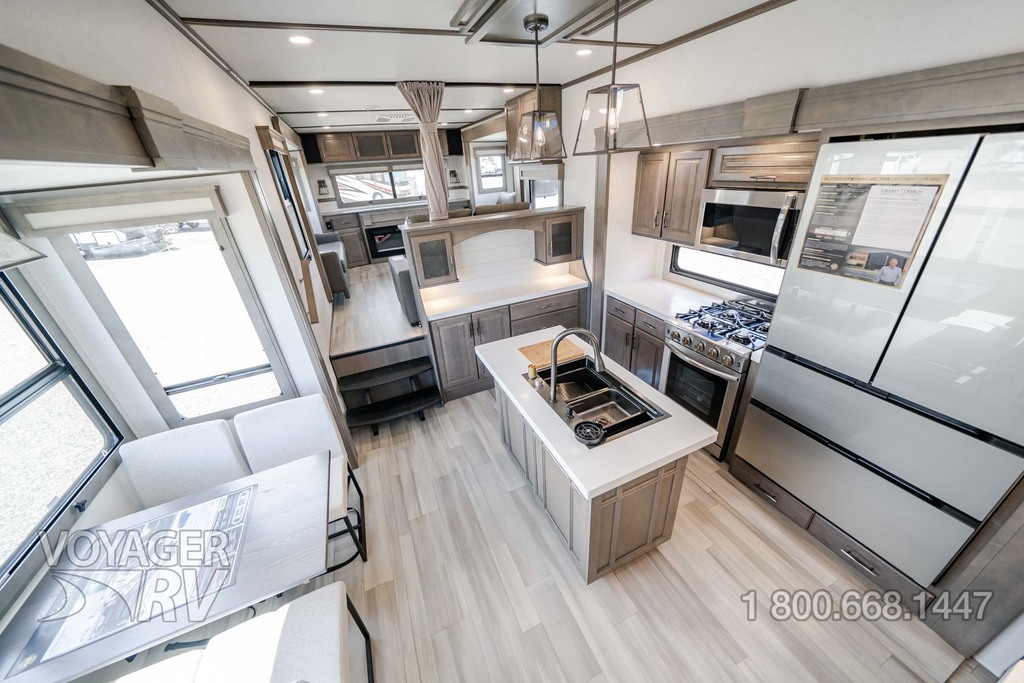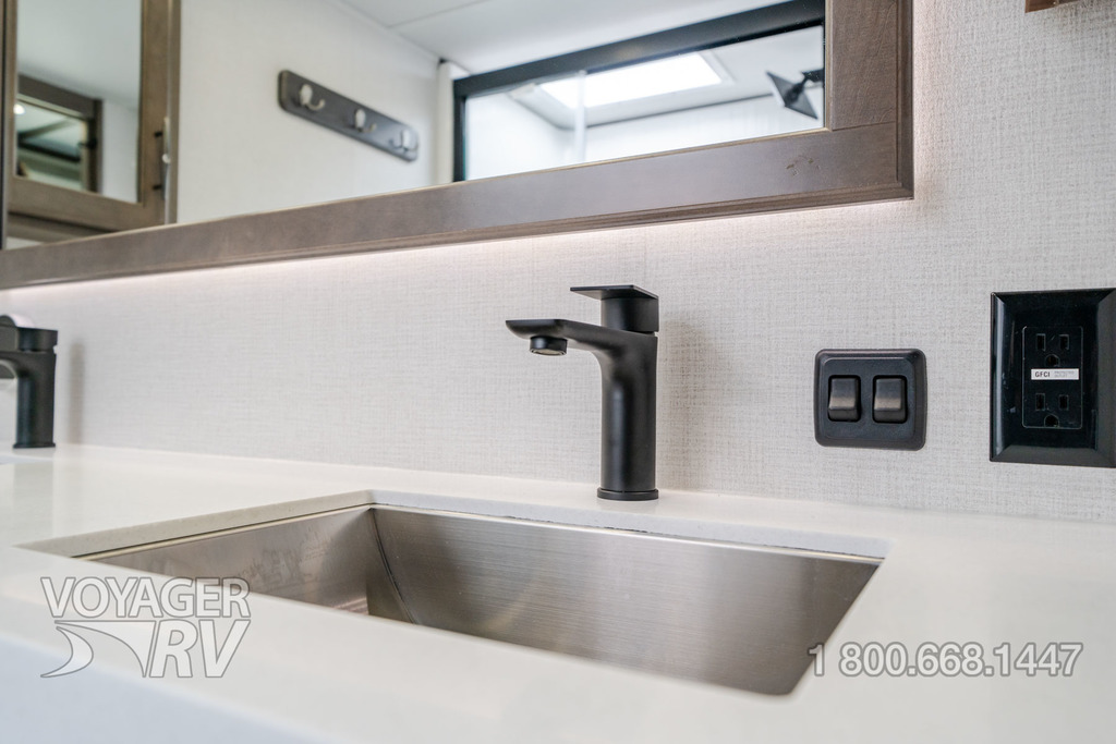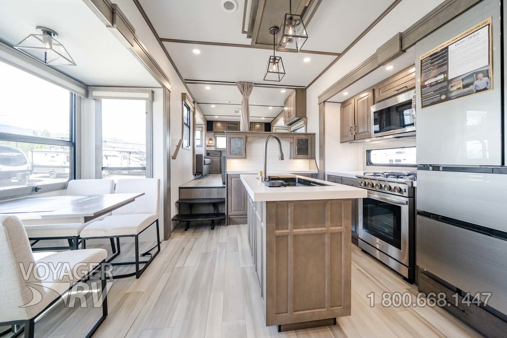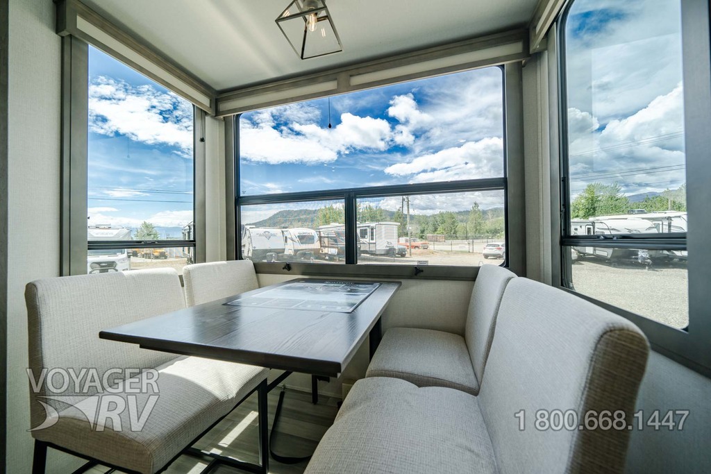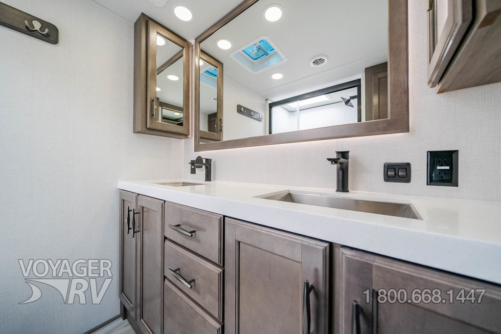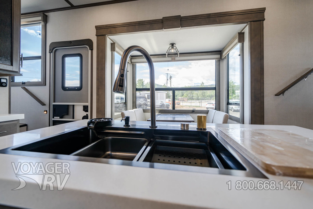 - Residential Living Package: LED Smart TV in Living Area, Rockford Fosgate Stereo Ent. System w/ HDMI and App Controls, Exterior Speakers, Night Stands with USB Ports, Bedside 110-Volt Outlets (2), Keyed Alike, SolidStep Quad Entry Steps, Stealth A/C System, Premium Roller Shades, Hardwood Window Treatments, Congoleum Flooring, Hallway Handrail, Recessed LED Ceiling Lighting, Interior LED Accent Lighting, Hardwood Cabinet Doors, Signature Wall Mounted Dinette Table w/4 Padded Chairs, Theatre Seating, Tri-Fold Hide-A-Bed Sofa, Smoke Detector, LP Alarm, Carbon Monoxide Alarm, Solid Surface Countertops, Smart Sink w/ removeable cutting board, produce strainer and glass rinser.