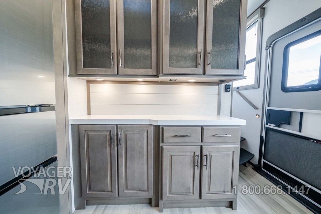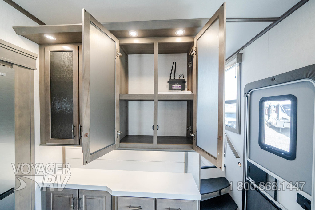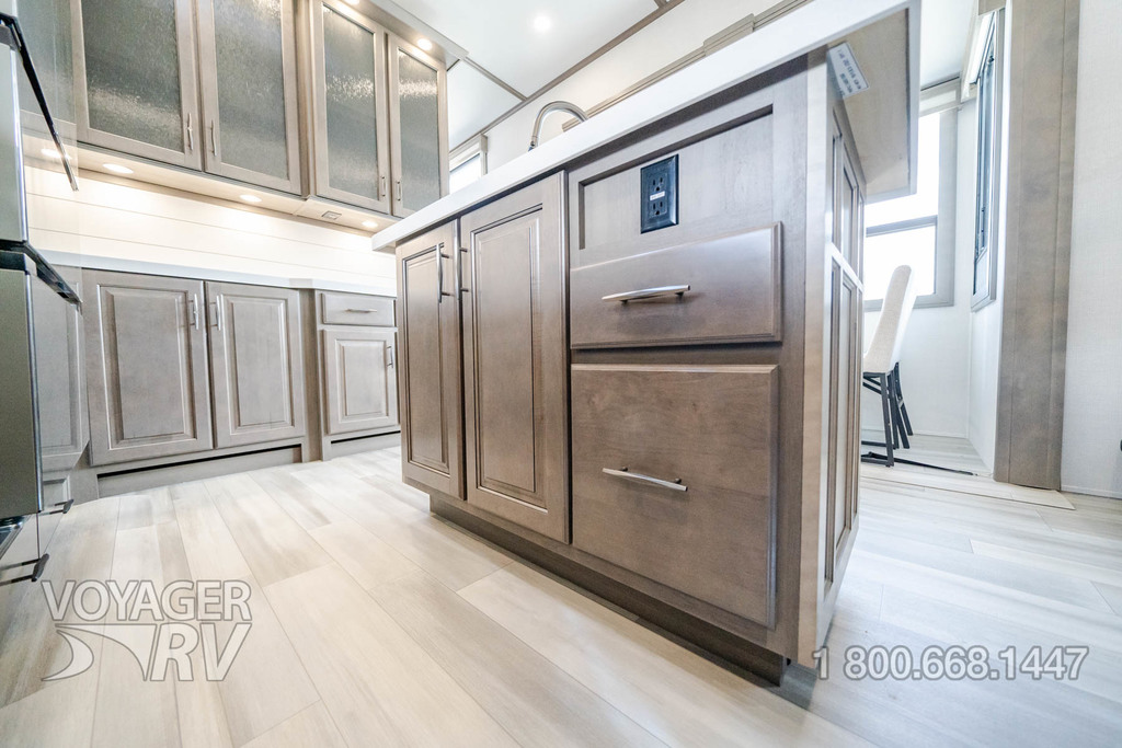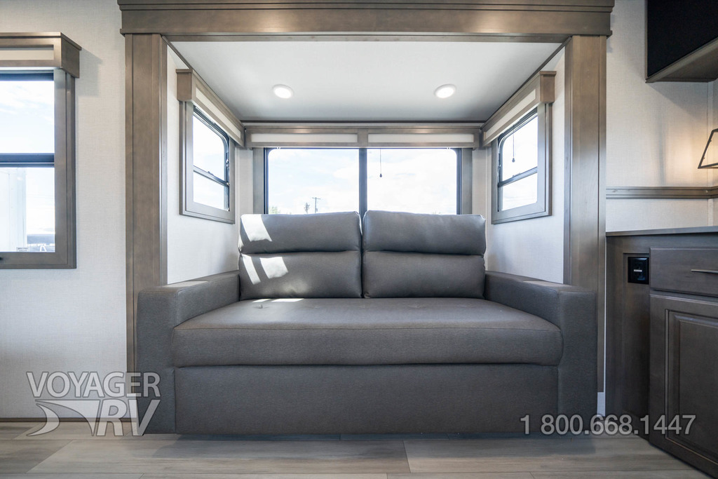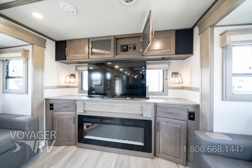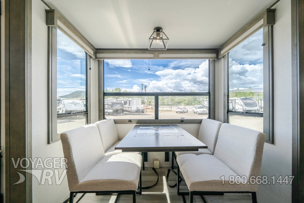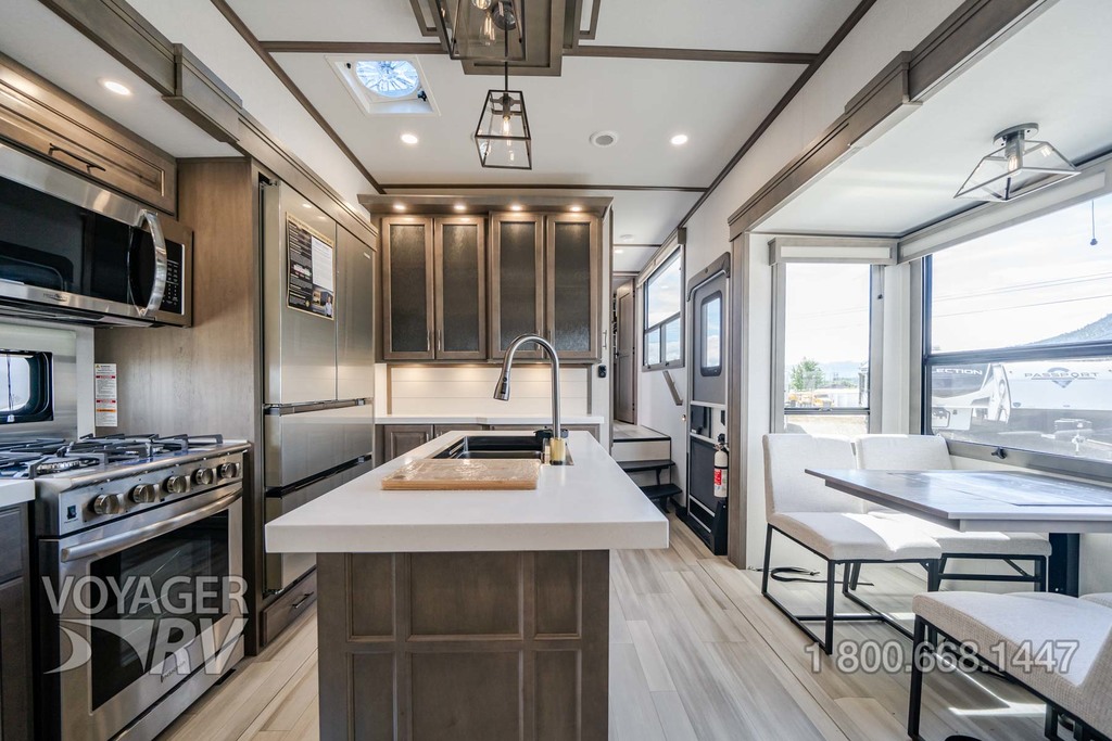 - Residential Living Package: LED Smart TV in Living Area, Rockford Fosgate Stereo Ent. System w/ HDMI and App Controls, Exterior Speakers, Night Stands with USB Ports, Bedside 110-Volt Outlets (2), Keyed Alike, SolidStep Quad Entry Steps, Stealth A/C System, Premium Roller Shades, Hardwood Window Treatments, Congoleum Flooring, Hallway Handrail, Recessed LED Ceiling Lighting, Interior LED Accent Lighting, Hardwood Cabinet Doors, Signature Wall Mounted Dinette Table w/4 Padded Chairs, Theatre Seating, Tri-Fold Hide-A-Bed Sofa, Smoke Detector, LP Alarm, Carbon Monoxide Alarm, Solid Surface Countertops, Smart Sink w/ removeable cutting board, produce strainer and glass rinser.