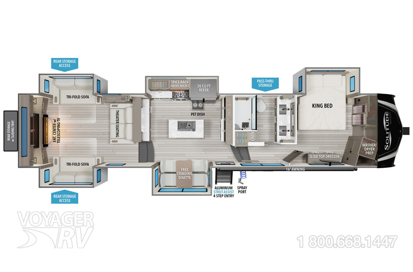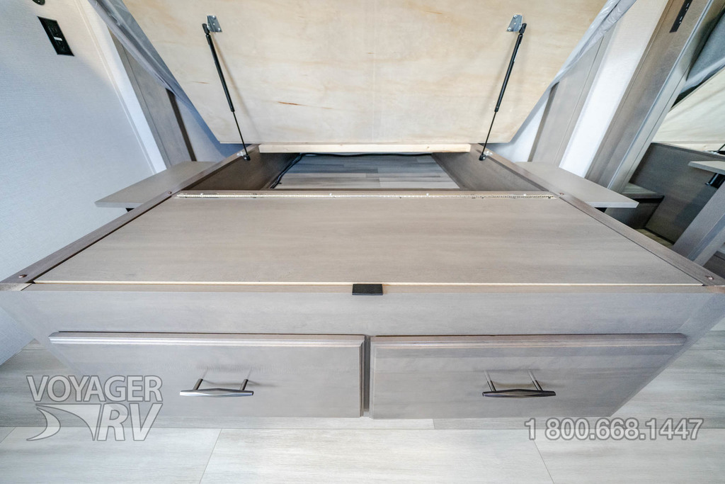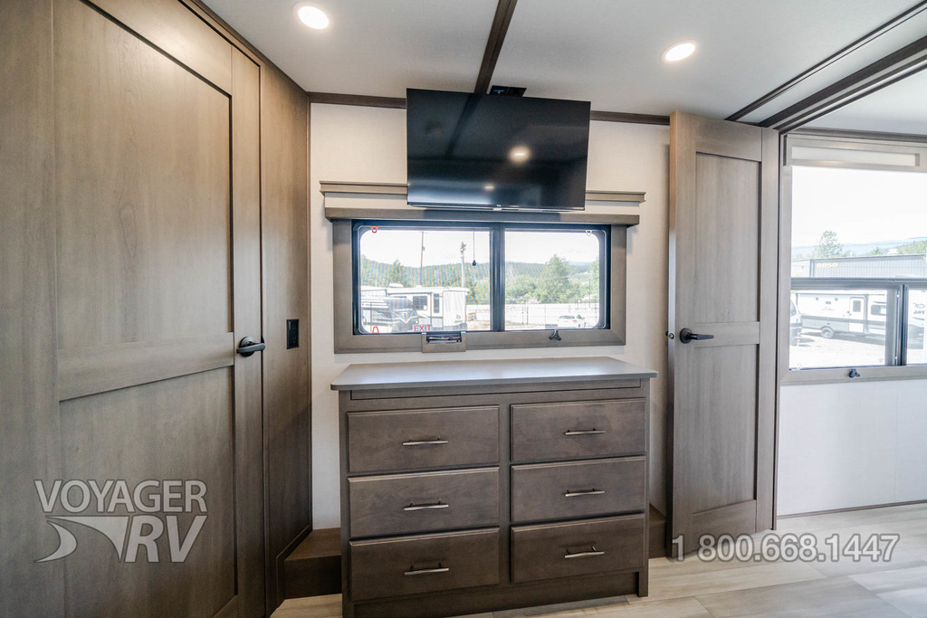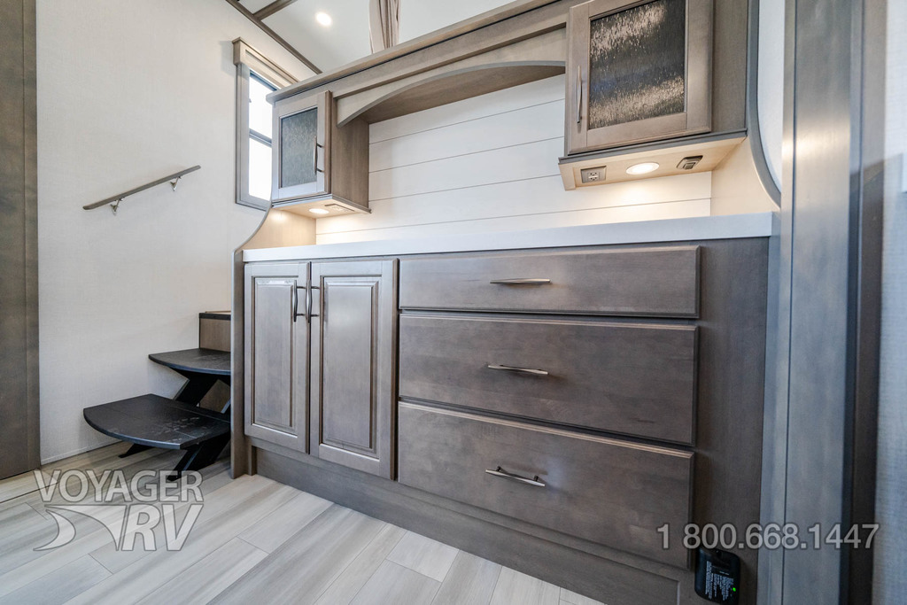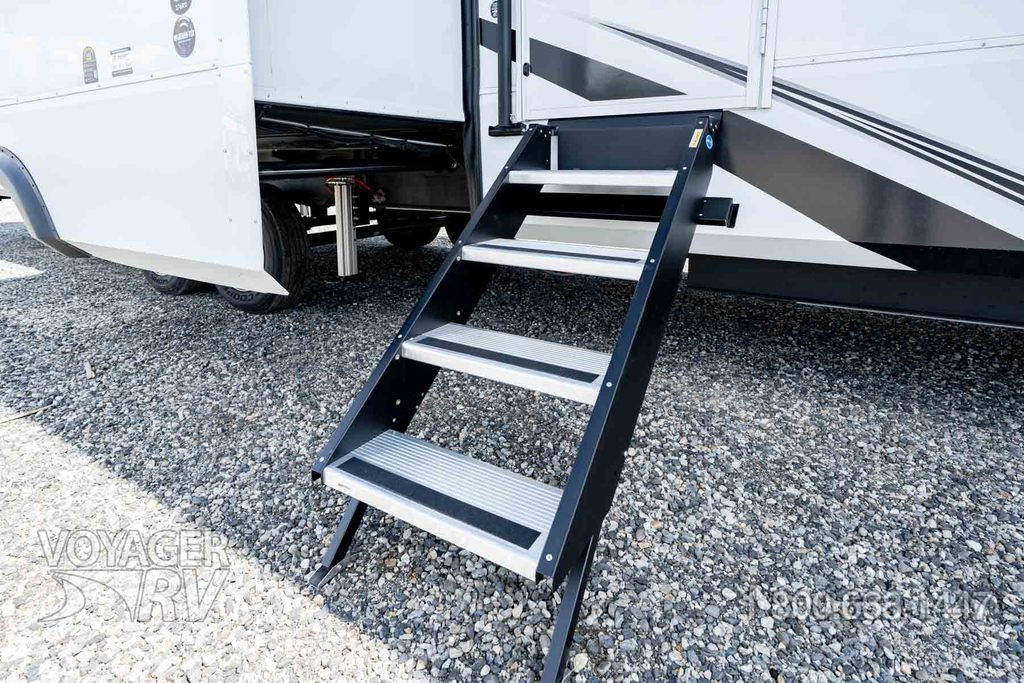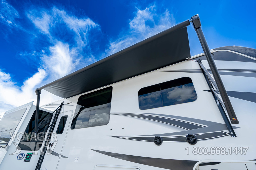 - Peace of Mind Package: Exterior Cable/Satellite Plug-In, Dresser w/ Slide-Top Hidden Storage, MORryde Pin Box, MORryde CRE3000 Suspension System, ABS Braking System, Spare Tire (Undermount), Power Patio Awning with Integrated LED Lighting, Sewer Hose Storage Area, Kitchen 12-Volt High Power MaxxAir Fan with Rain Sensor, Washer/Dryer Prep, Whole House Water Filtration System, Easy Clean Solid Surface Steps.