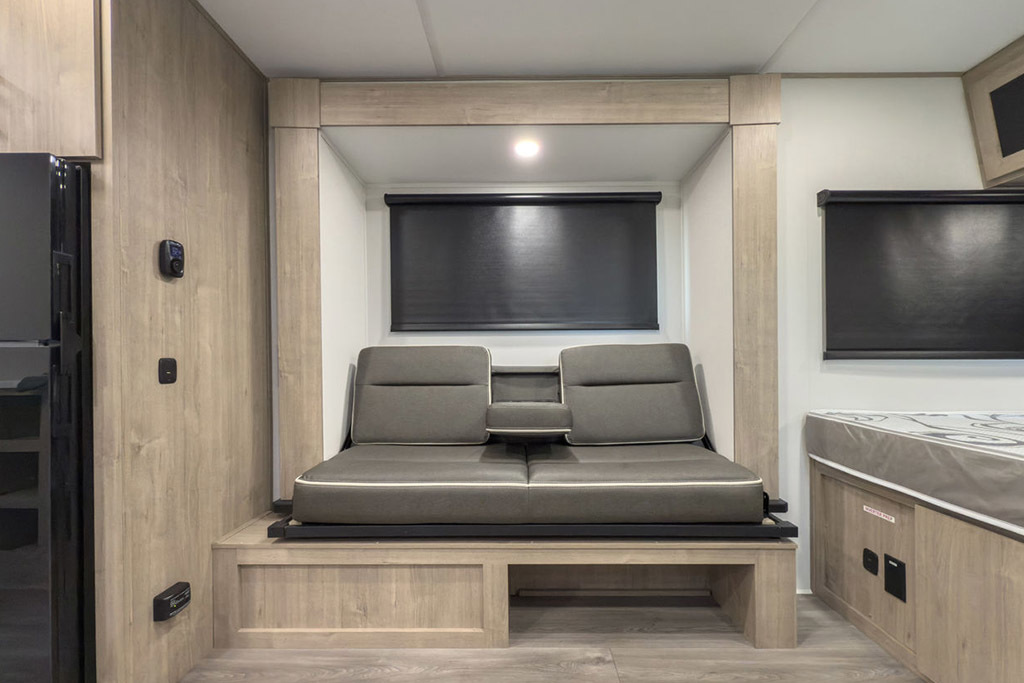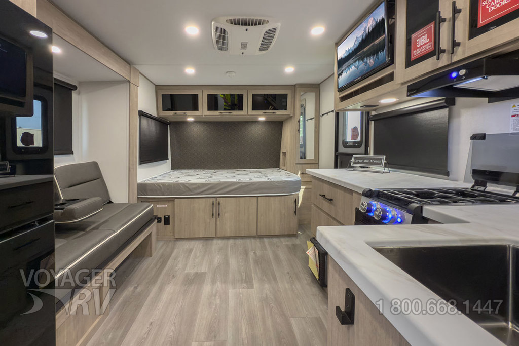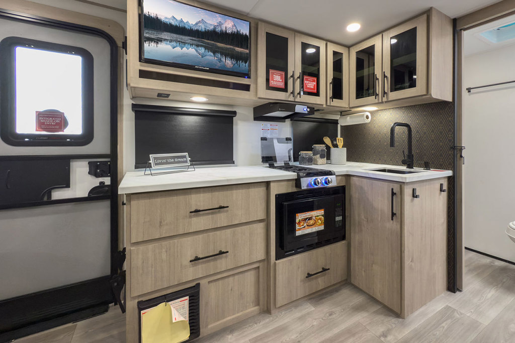 - Ultimate Power Package: Adjustable Power Awning w/LED Lights, LED Interior Lighting w/Dimming, 30 AMP Service, Hi Definition Smart LED TV, Detachable Power Cord, High Efficiency AC System, Motion Sensor LED Night Light, Power Tongue Jack, Exterior Cable Hookup, Compass Connect, Tire Linc TPMS Prep, JBL Bluetooth Audio System, Inverter Prep, Backup Camera Prep, Pass-Thru.