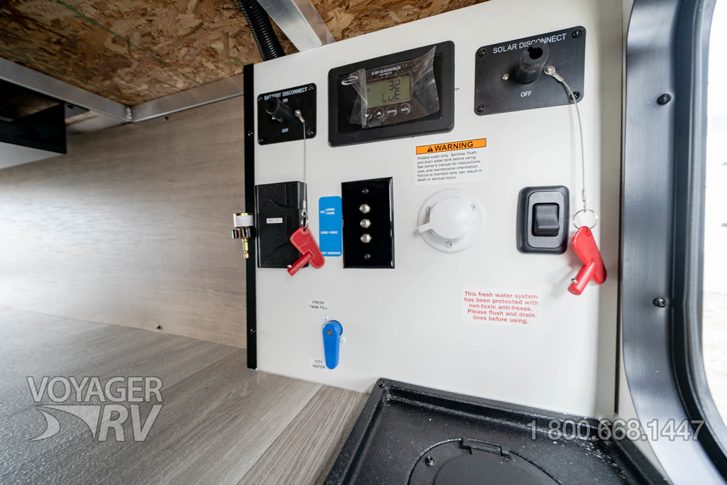 - Solar Package: 200W Roof Mounted Solar Panel, Roof Mounted Quick Connect Plugs, 30AMP Charge Controller, Solar Disconnect Switch, Battery Disconnect Switch, 12V Refrigerator.