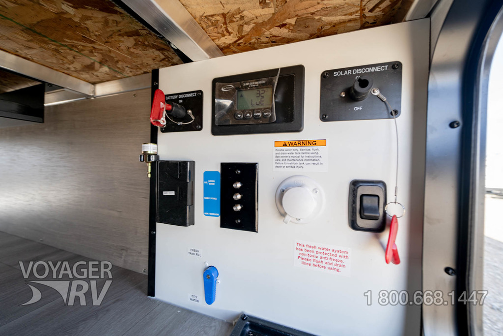- Solar Package: 200W Roof Mounted Solar Panel, Roof Mounted Quick Connect Plugs, 30AMP Charge Controller, Solar Disconnect Switch, Battery Disconnect Switch, 12V Refrigerator.