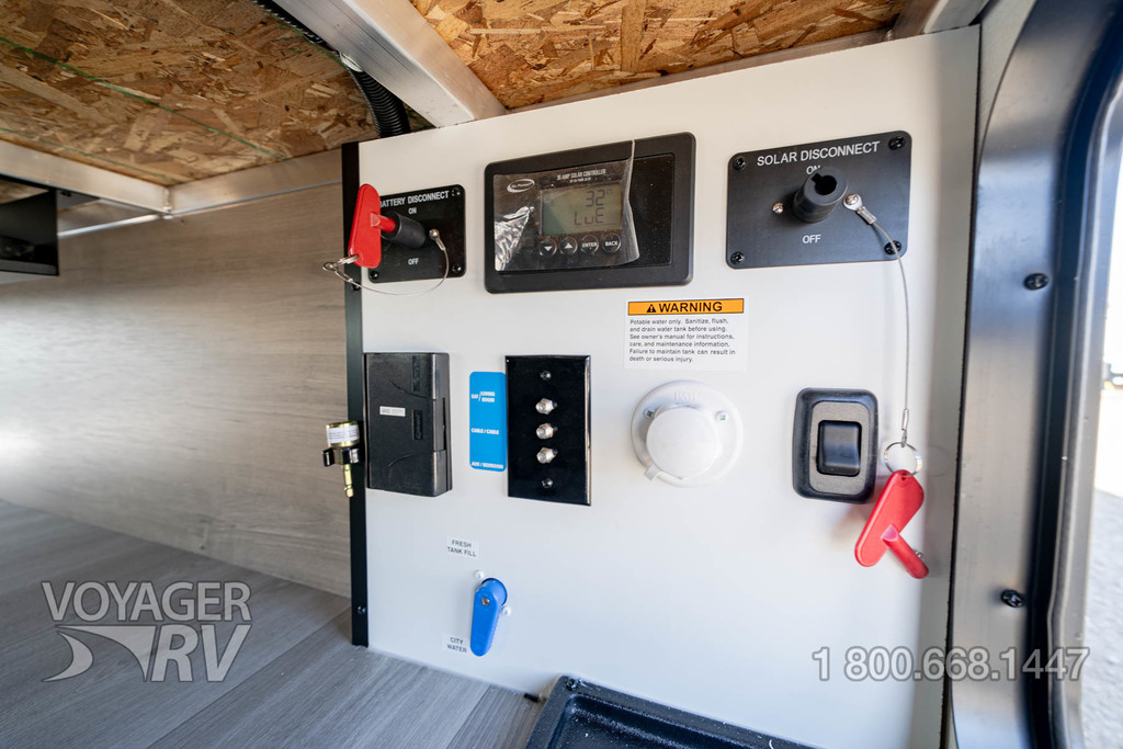 - Solar Package: 200W Roof Mounted Solar Panel, Roof Mounted Quick Connect Plugs, 30AMP Charge Controller, Solar Disconnect Switch, Battery Disconnect Switch, 12V Refrigerator.