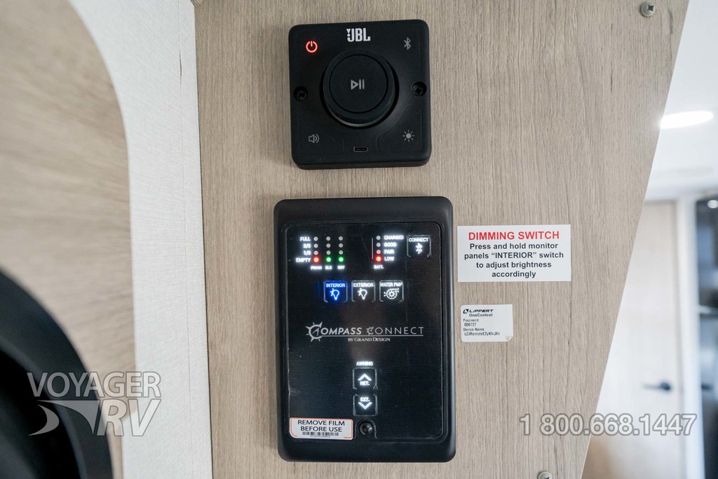 - Ultimate Power Package: Adjustable Power Awning w/LED Lights, LED Interior Lighting w/Dimming, 30 AMP Service, Hi Definition Smart LED TV, Detachable Power Cord, High Efficiency AC System, Motion Sensor LED Night Light, Power Tongue Jack, Exterior Cable Hookup, Compass Connect, Tire Linc TPMS Prep, JBL Bluetooth Audio System, Inverter Prep, Backup Camera Prep, Pass-Thru.