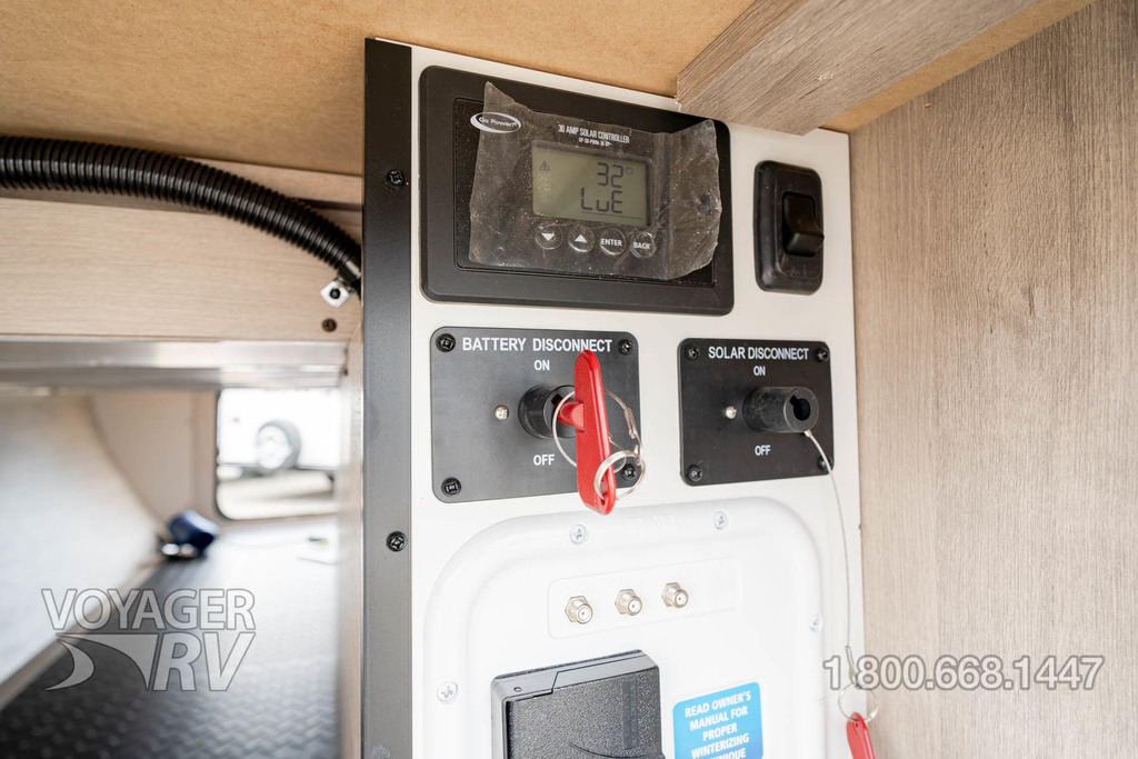 - Solar Package: 200W Roof Mounted Solar Panel, Roof Mounted Quick Connect Plugs, 30AMP Charge Controller, Solar Disconnect Switch, Battery Disconnect Switch, 12V 10CU FT Refrigerator.