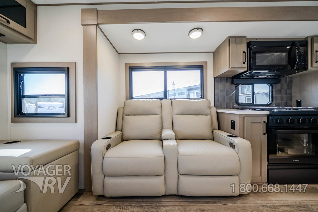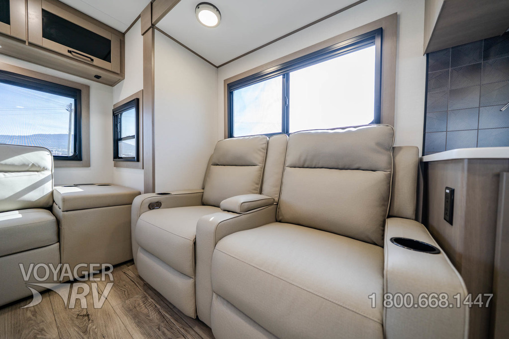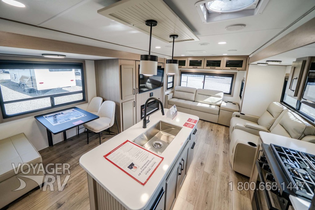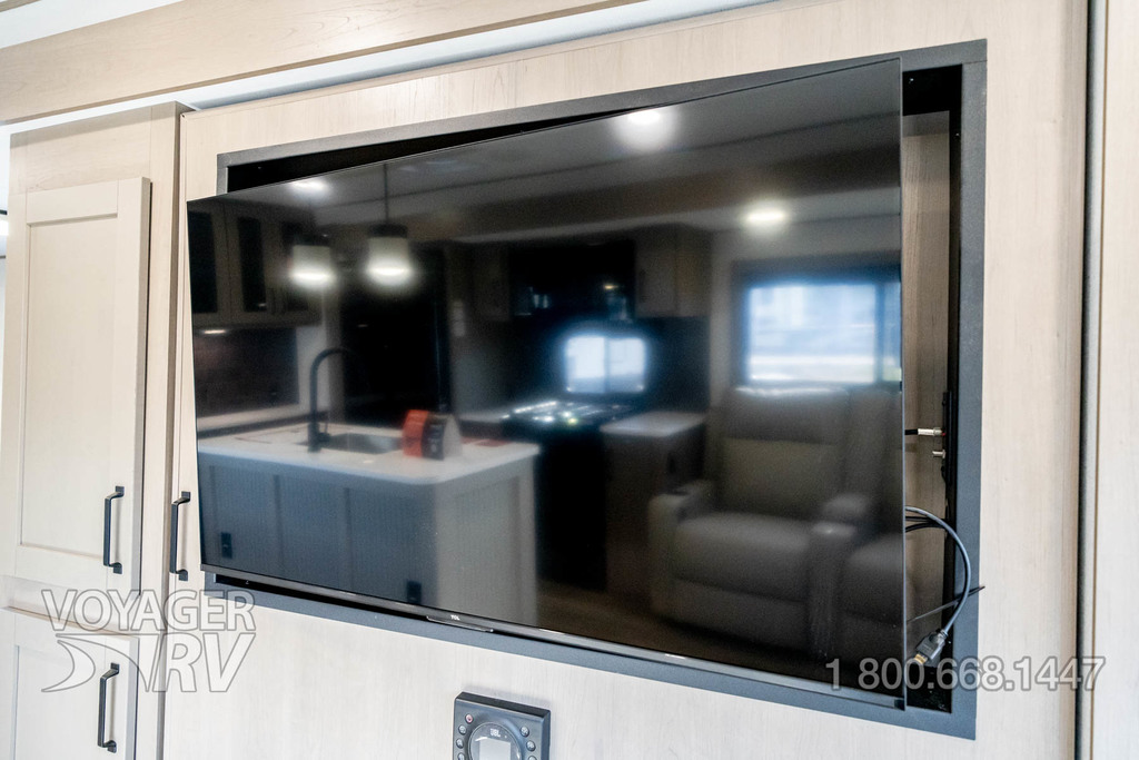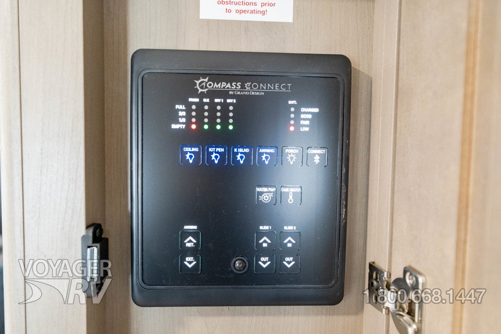 - Ultimate Power Package: 50 AMP Service w/ 2nd A/C Prep, Microwave w/ Vented Range Hood, MaxxAir Fan, Electric Awning, AM/FM Bluetooth Stereo, Smart TV, Detachable Power Cord, Compass Connect w/ Dimmable Lighting Feature, Motion Sensor Lights, LED Interior Lighting, Distribution Box.