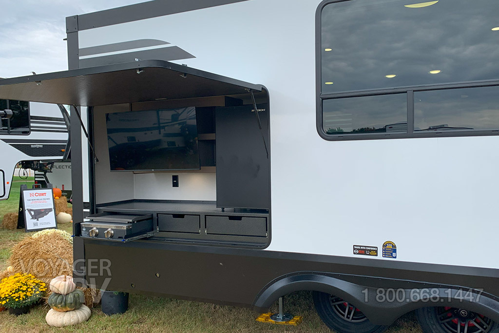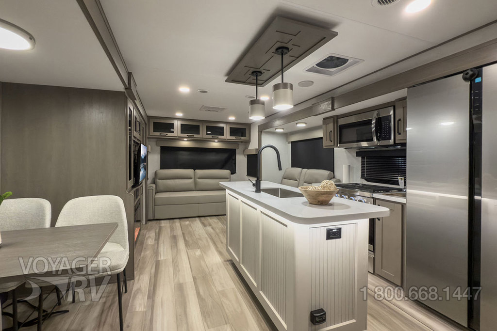 - Ultimate Power Package: 50 AMP Service w/ 2nd A/C Prep, Microwave w/ Vented Range Hood, MaxxAir Fan, Electric Awning, AM/FM Bluetooth Stereo, Smart TV, Detachable Power Cord, Compass Connect w/ Dimmable Lighting Feature, Motion Sensor Lights, LED Interior Lighting, Distribution Box.