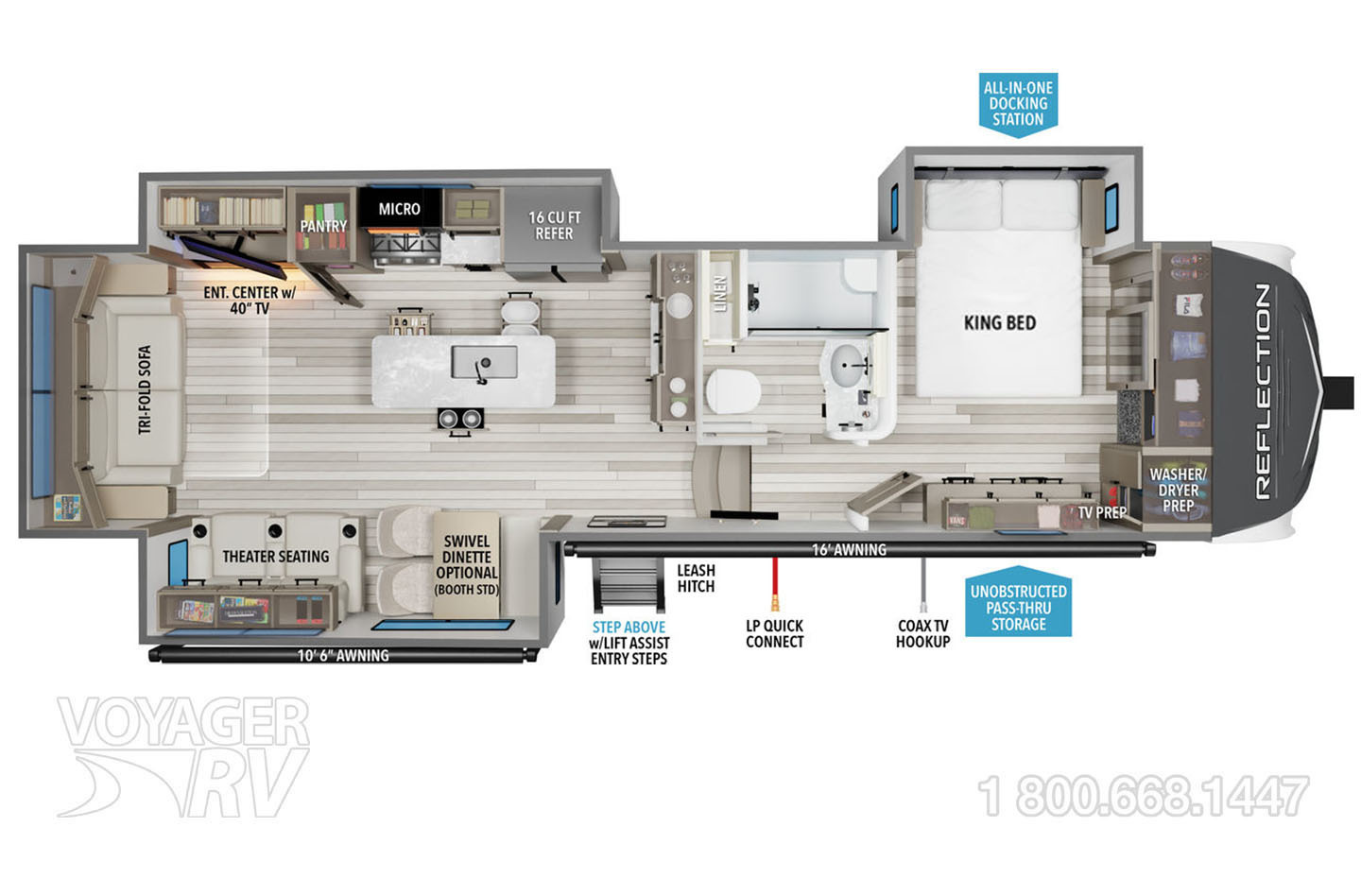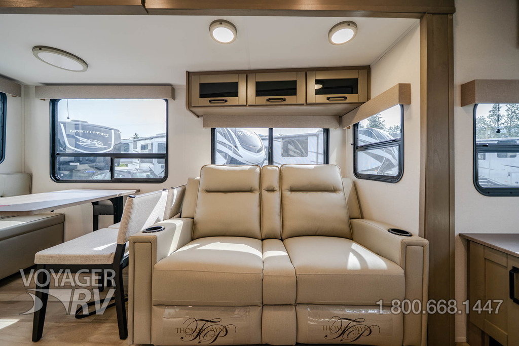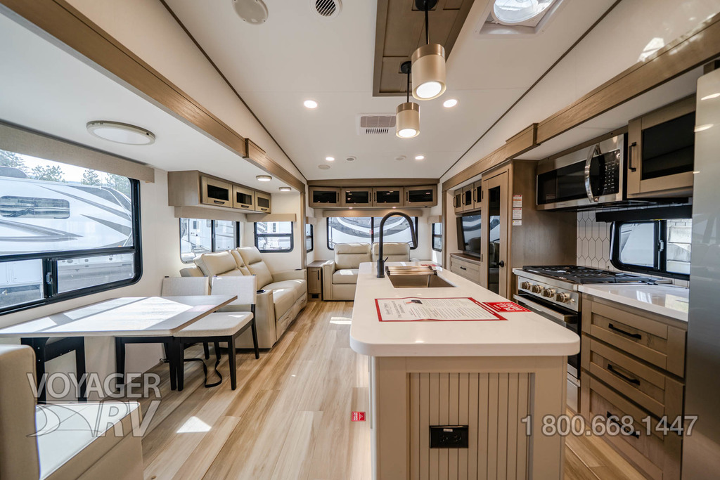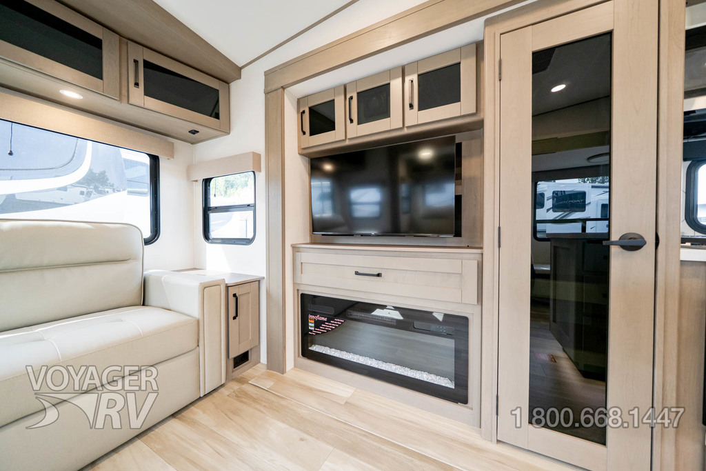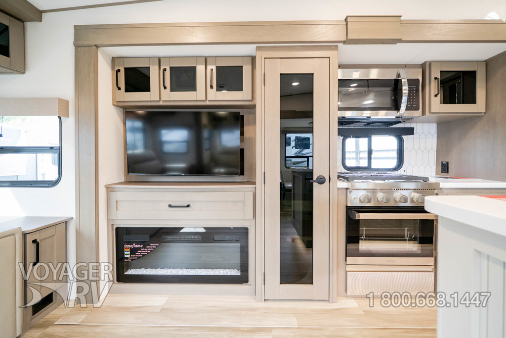 - Ultimate Power Package: 50 AMP Service w/ 2nd A/C Prep, Microwave w/ Vented Range Hood, MaxxAir Fan, Electric Awning, AM/FM Bluetooth Stereo, Smart TV, Detachable Power Cord, Compass Connect w/ Dimmable Lighting Feature, Motion Sensor Lights, LED Interior Lighting, Distribution Box.