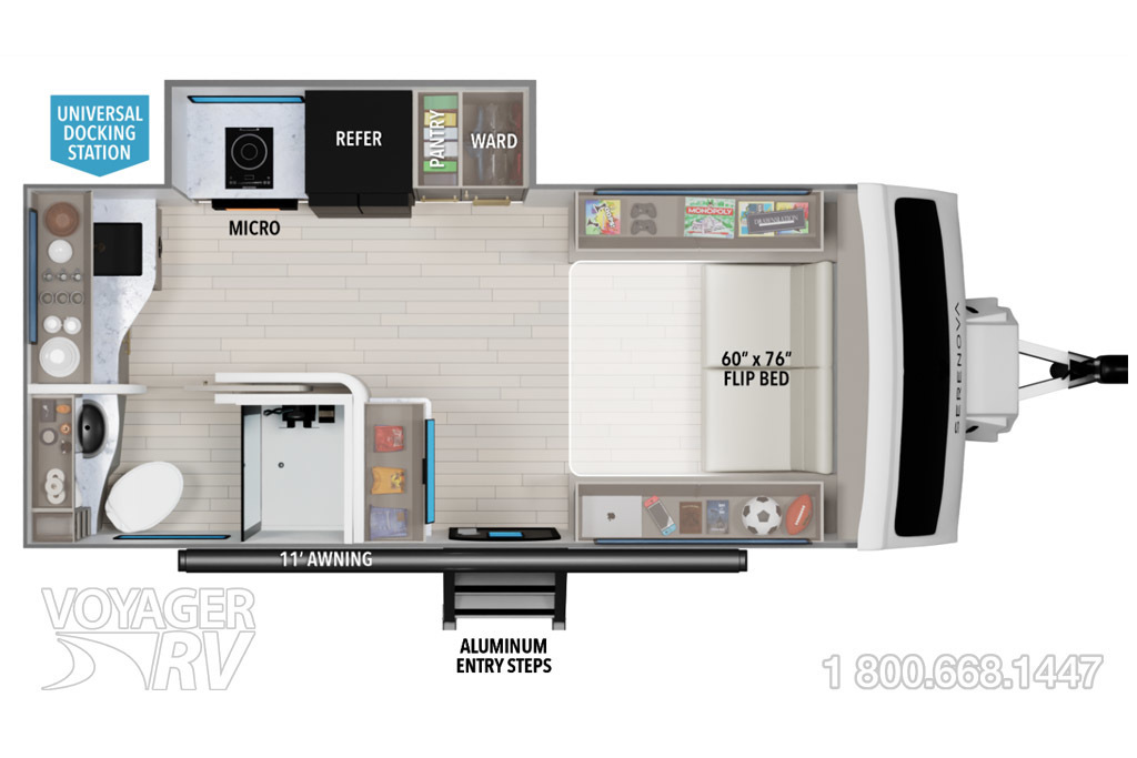 - Serenova Gemini Package: BAL 5.1 Power Stabilizing System, Fiberglass Front Cap with Automotive Windshield, Installed Voyager Back Up Camera System, Waterproof Composite Floor Decking, Backlit Entry Handle, Armless Power Awning with LED Lights, Accessory Hitch Receiver, Convenient Exterior Storage with Metal Slam Latch, Universal Docking Station, 2x 20lb Propane Tanks, Black Tank Flush, Dedicated Sewer Hose Carrier, 50 AMP Service.