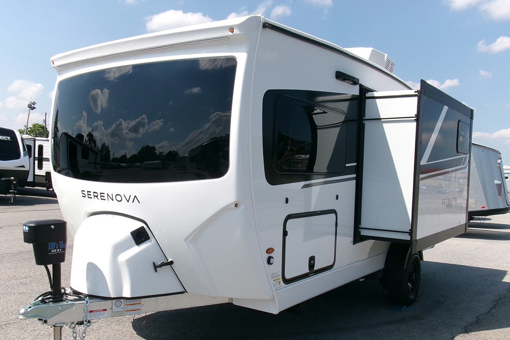 - Serenova Gemini Package: BAL 5.1 Power Stabilizing System, Fiberglass Front Cap with Automotive Windshield, Installed Voyager Back Up Camera System, Waterproof Composite Floor Decking, Backlit Entry Handle, Armless Power Awning with LED Lights, Accessory Hitch Receiver, Convenient Exterior Storage with Metal Slam Latch, Universal Docking Station, 2x 20lb Propane Tanks, Black Tank Flush, Dedicated Sewer Hose Carrier, 50 AMP Service.