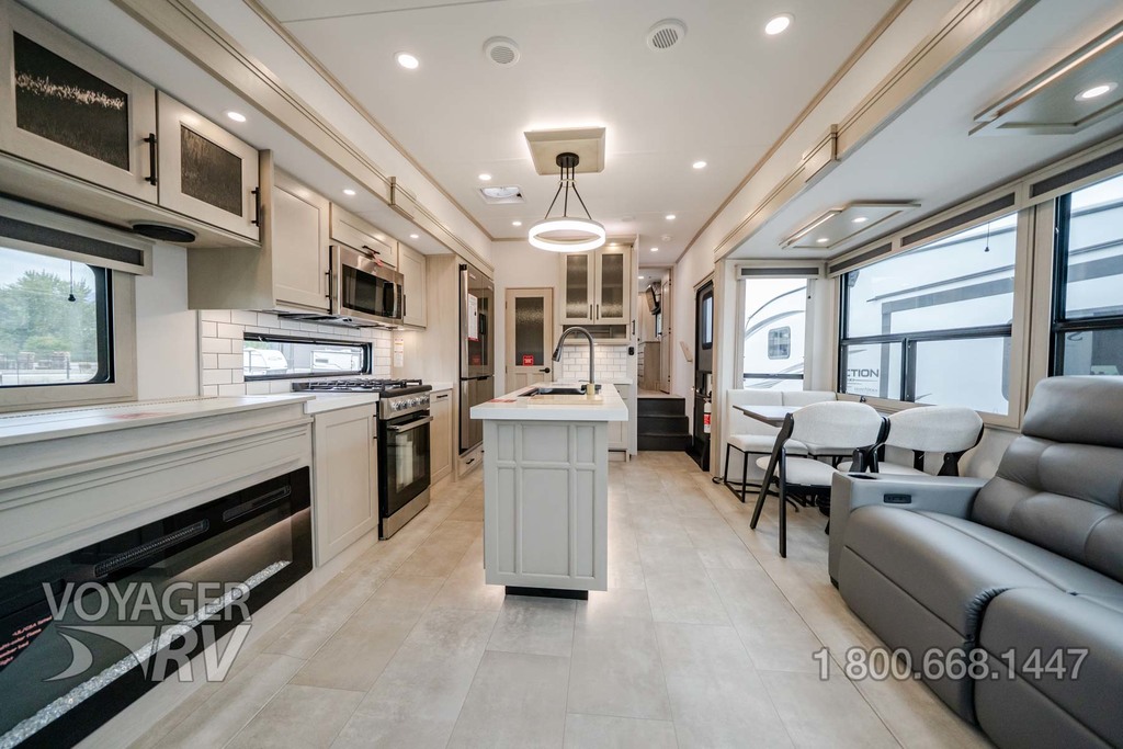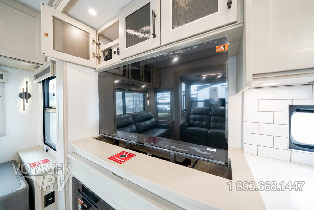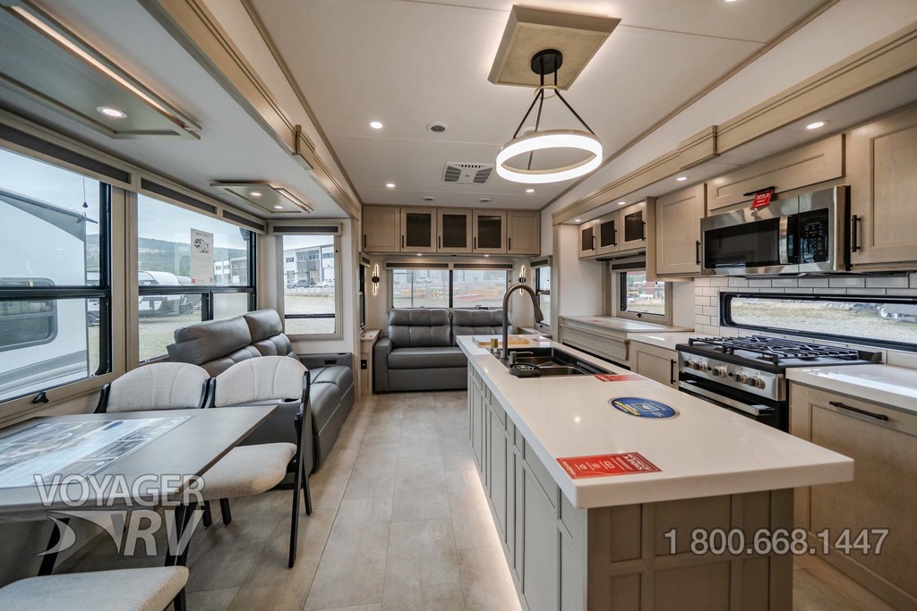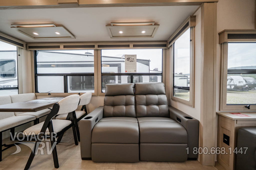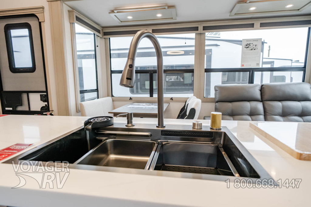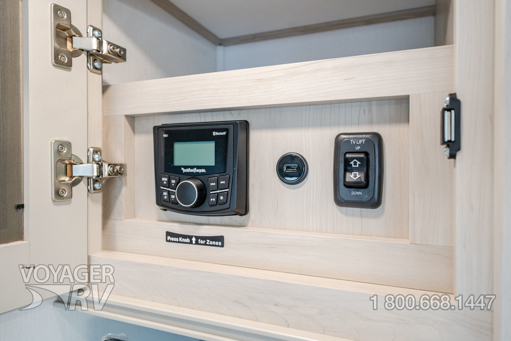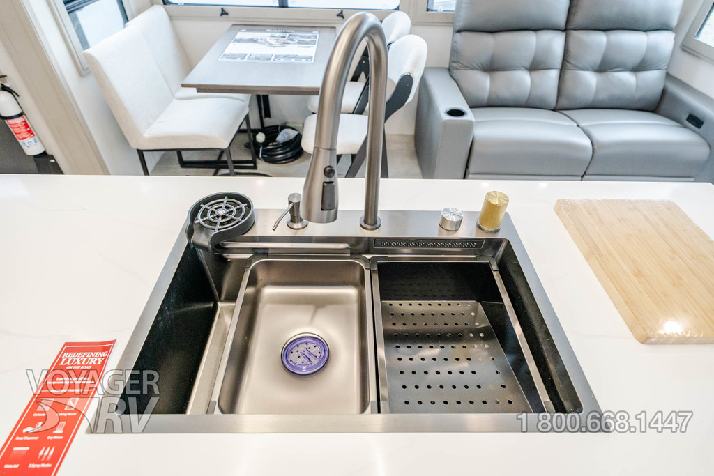 - Residential Living Package: LED Smart TV in Living Area, Rockford Fosgate Stereo Ent. System w/ HDMI and App Controls, Exterior Speakers, Night Stands with USB Ports, Bedside 110-Volt Outlets (2), Keyed Alike, MORryde Strut Assist Entry Steps, Stealth A/C System, Premium Roller Shades, Hardwood Window Treatments, Congoleum Flooring w/3-Year Warranty, Hallway Handrail, Recessed LED Ceiling Lighting, Interior LED Accent Lighting, Hardwood Cabinet Doors, Signature Wall Mounted Dinette Table w/4 Padded Chairs, Theater Seating, Tri-Fold Hide-A-Bed Sofa, Smoke Detector, LP Alarm, Carbon Monoxide Alarm, Solid Surface Countertops, Smart Sink w/ removeable cutting board, produce strainer and glass rinser.