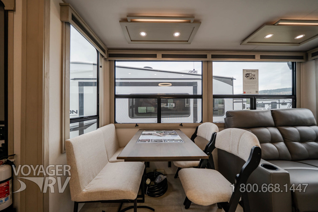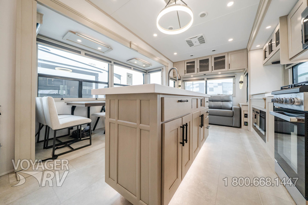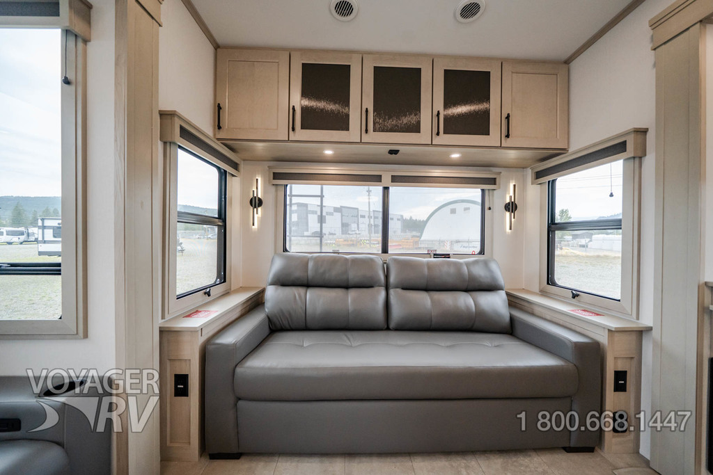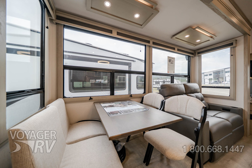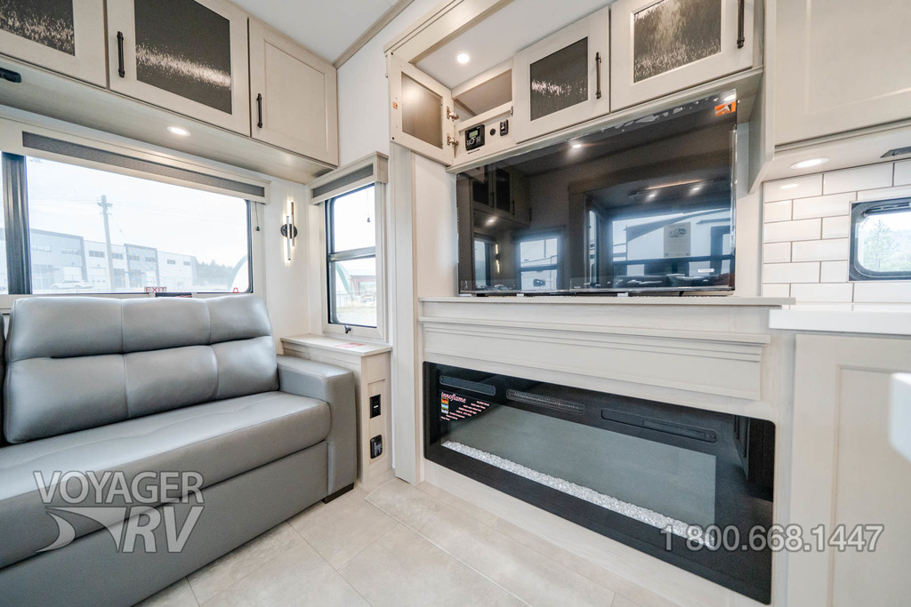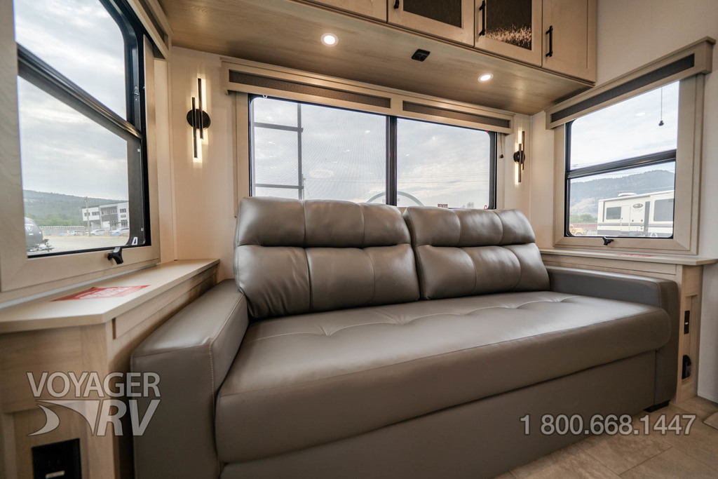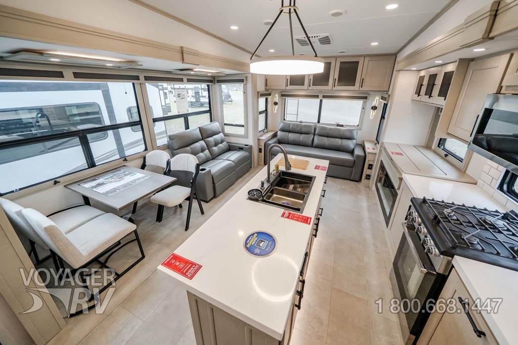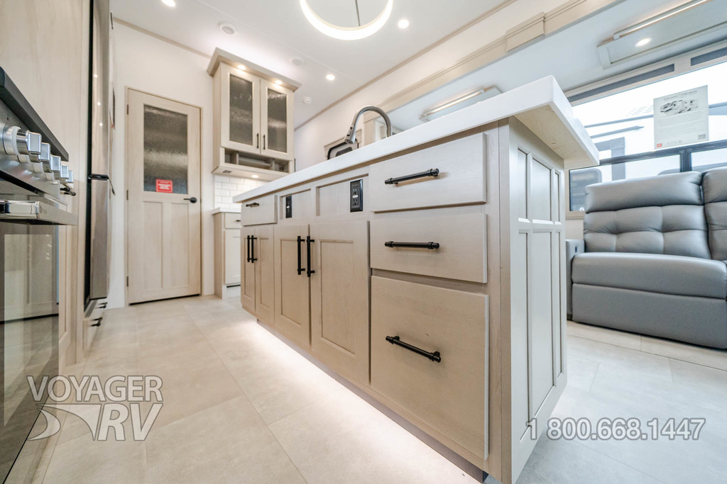 - Residential Living Package: LED Smart TV in Living Area, Rockford Fosgate Stereo Ent. System w/ HDMI and App Controls, Exterior Speakers, Night Stands with USB Ports, Bedside 110-Volt Outlets (2), Keyed Alike, MORryde Strut Assist Entry Steps, Stealth A/C System, Premium Roller Shades, Hardwood Window Treatments, Congoleum Flooring w/3-Year Warranty, Hallway Handrail, Recessed LED Ceiling Lighting, Interior LED Accent Lighting, Hardwood Cabinet Doors, Signature Wall Mounted Dinette Table w/4 Padded Chairs, Theater Seating, Tri-Fold Hide-A-Bed Sofa, Smoke Detector, LP Alarm, Carbon Monoxide Alarm, Solid Surface Countertops, Smart Sink w/ removeable cutting board, produce strainer and glass rinser.