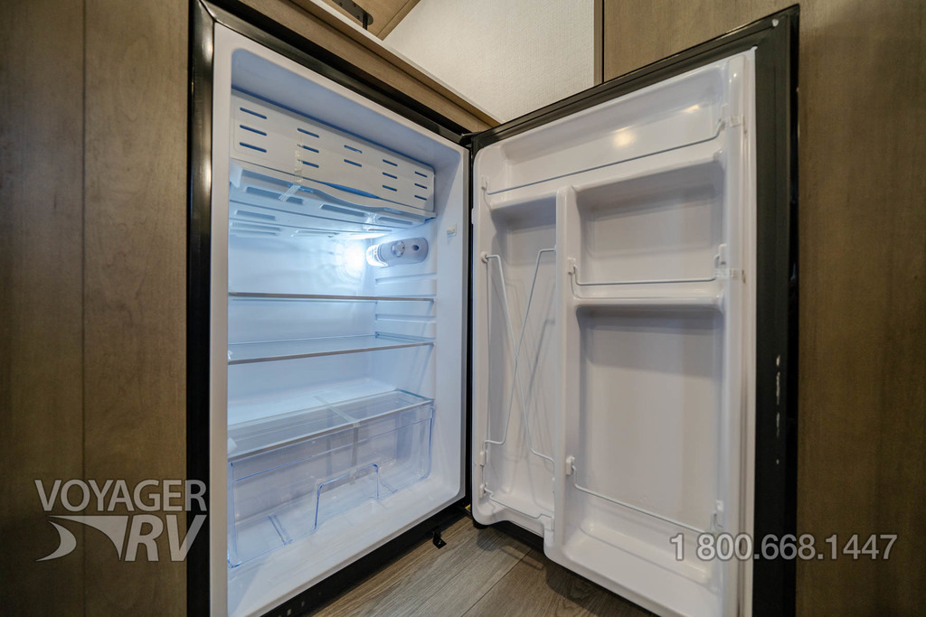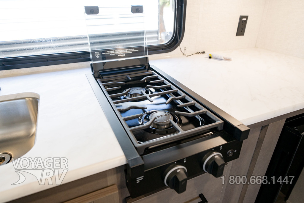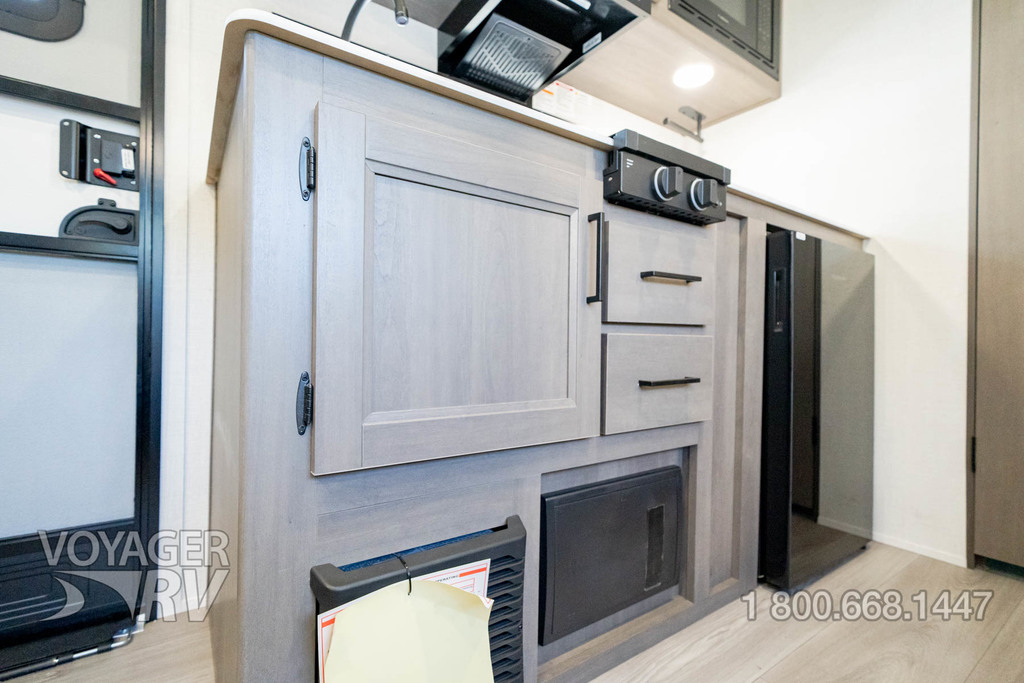 - ONE Premier Kitchen Package: 12V 3.3 Cube Refrigerator and Freezer w/ Glass Front, Paper Towel Holder, Integrated Spice Rack, Kitchen Soap Dispenser, Drawers w/ Metal Drawer Guides, Thermoformed and Seamless Countertop, 2-Burner Range w/ Glass Cover, Multiple Outlets.