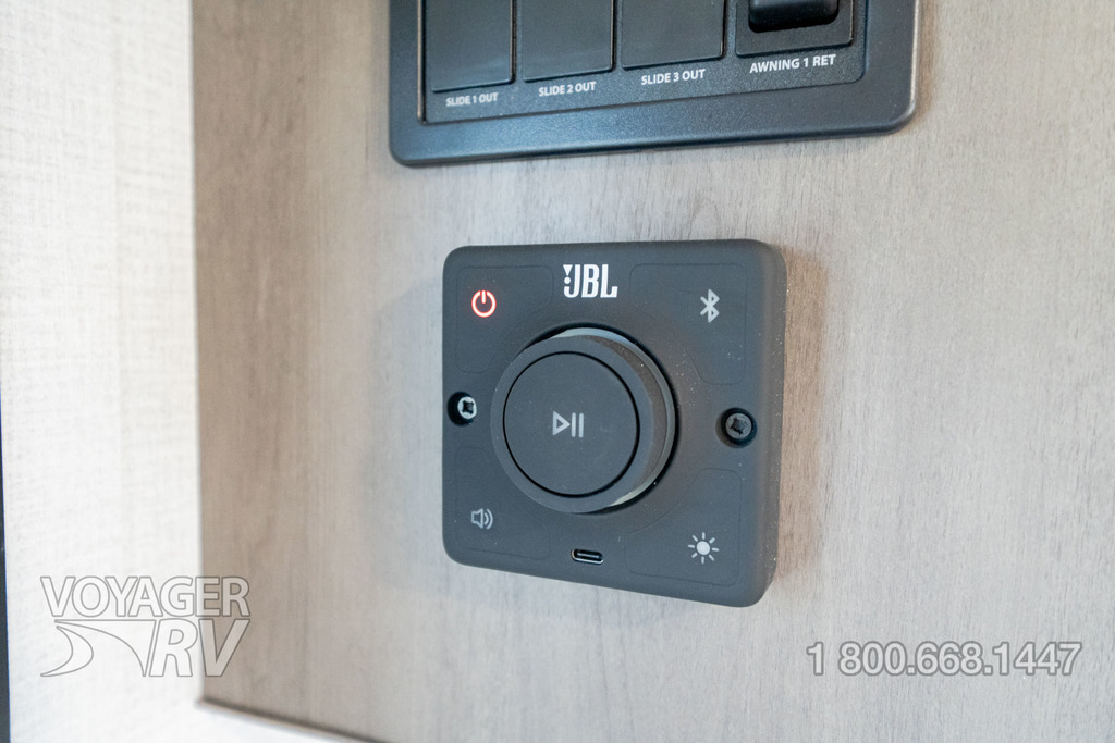 - ONE Power and Entertainment Package: JBL Head Unit, JBL Interior and Exterior Speakers, Flush Mount Interior Lighting, Power Awning w/ Exterior Fusion Light, USB Ports, HD TV Antenna.