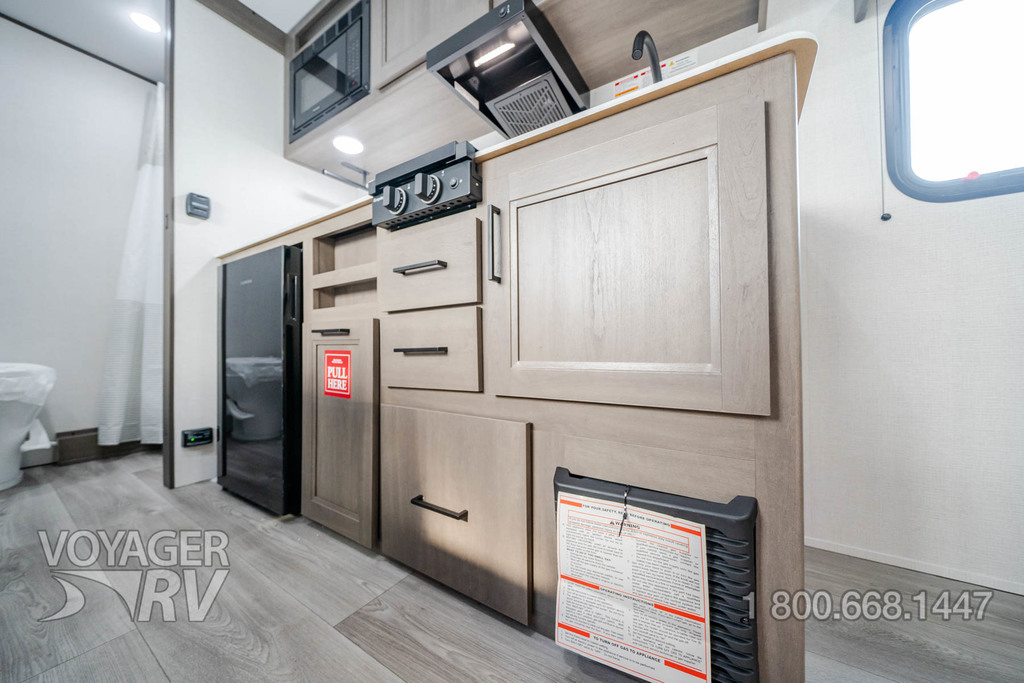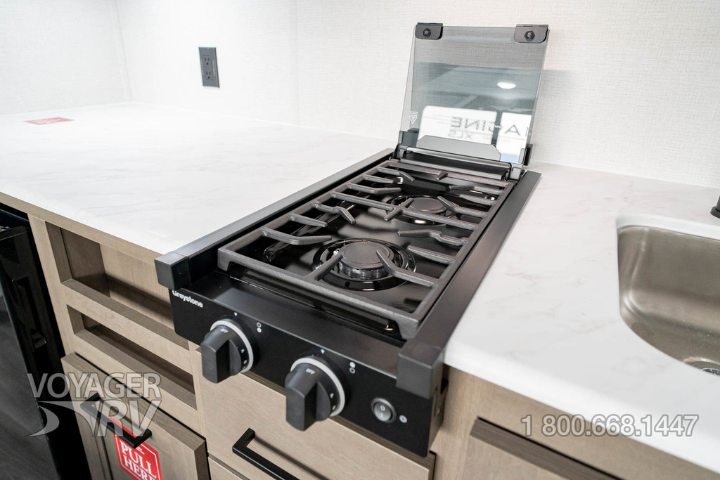 - ONE Premier Kitchen Package: 12V 3.3 Cube Refrigerator and Freezer w/ Glass Front, Paper Towel Holder, Integrated Spice Rack, Kitchen Soap Dispenser, Drawers w/ Metal Drawer Guides, Thermoformed and Seamless Countertop, 2-Burner Range w/ Glass Cover, Multiple Outlets.