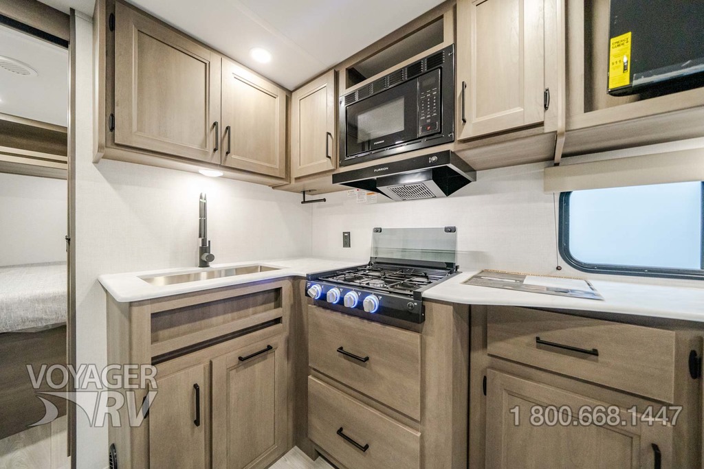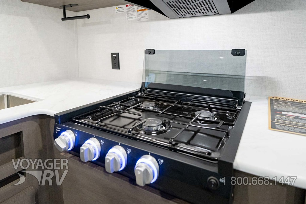 - Thermoformed and Seamless Countertop, 3-Burner Range w/ Glass Cover, Pull-Down Spray Faucet, Multiple Outlets.