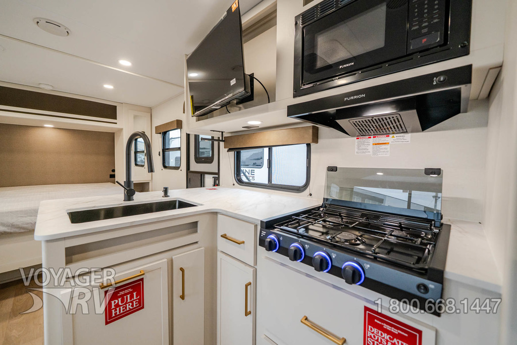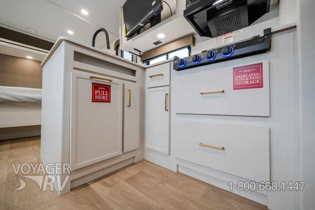 - Premium Kitchen Package: 12V 10.2 Cube French Door Refrigerator w/ Glass Front and Bottom Freezer, Dedicated Pots and Pans Storage Drawers, Paper Towel Holder, Under Cabinet Accent Lighting, Integrated Spice Rack, Black Metal Single Basin Kitchen Sink, Soap Dispenser, Drawers w/ Metal Drawer Guides, Thermoformed and Seamless Countertop, 3-Burner Range w/ Glass Cover, Pull-Down Spray Faucet, Multiple Outlets.