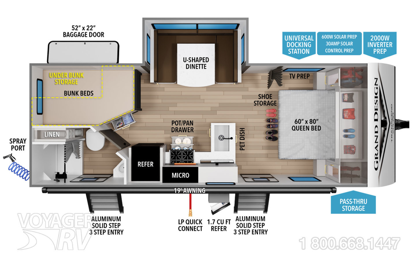 - Signature Living Package: Pull-Out Trash Can Storage w/ Removable Trash Can, 60 x 80 Queen Bed, On-Demand Tankless Water Heater, Interior/Exterior Fold Up Table w/ Dedicated Storage, Slim Shaker Cabinet Doors, Hidden Hinge Hardware, Flush Mount LED interior Lighting, Pull Out Pet Bowls in Dedicated Drawer, Exterior Leash Link, Exterior Bottle Opener, Shoe Nook Storage, Bedroom C-PAP and Electronics Nook, Bedroom Hanging and Folding Storage, Coat and Towel Hooks, LP Quick Connect.