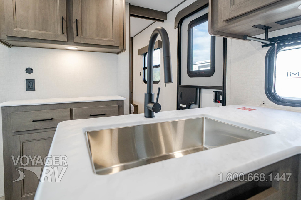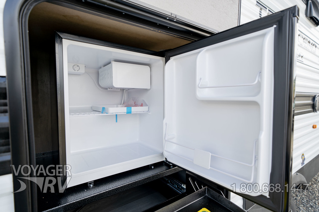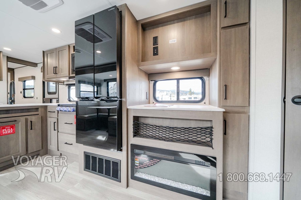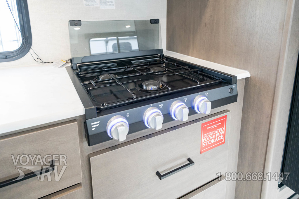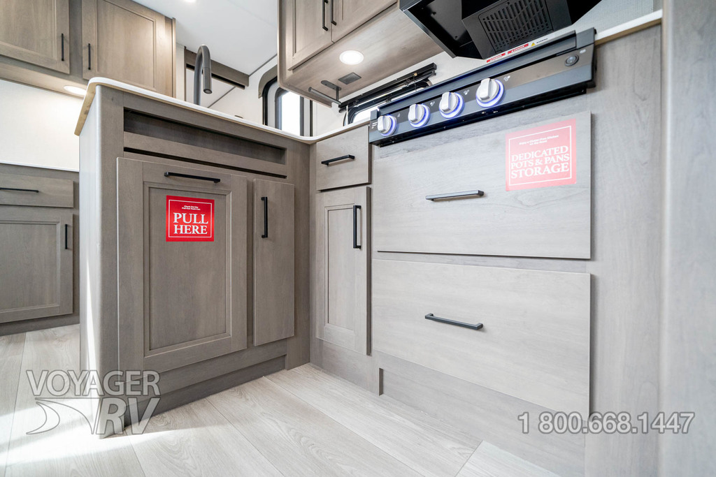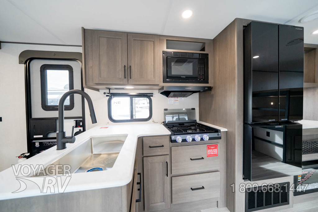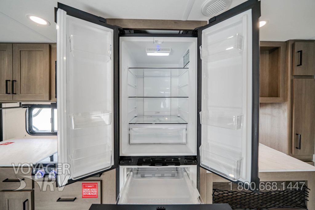 - Premium Kitchen Package: 12V 10.2 Cube French Door Refrigerator w/ Glass Front and Bottom Freezer, Dedicated Pots and Pans Storage Drawers, Paper Towel Holder, Under Cabinet Accent Lighting, Integrated Spice Rack, Black Metal Single Basin Kitchen Sink, Soap Dispenser, Drawers w/ Metal Drawer Guides, Thermoformed and Seamless Countertop, 3-Burner Range w/ Glass Cover, Pull-Down Spray Faucet, Multiple Outlets.