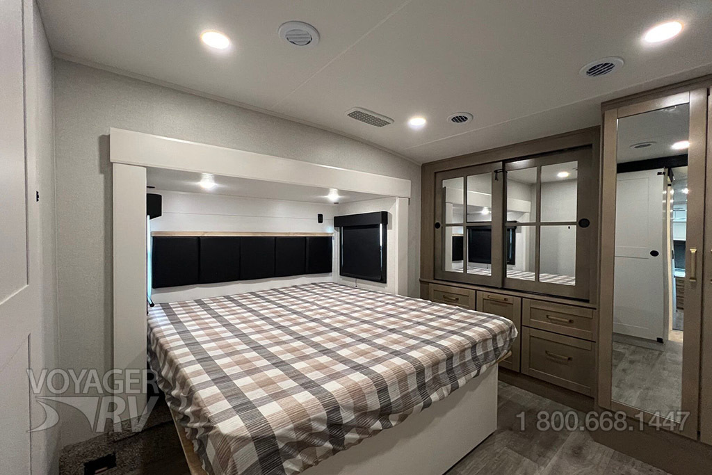 - Comfort Plus Package: 15K BTU "Whisper Quiet" Bedroom A/C, BM Pro Bluetooth Light Switches Throughout, King Bed (72"x80") Mattress w/Under Bed Storage, Larger Exterior Baggage Door Sizes, 2nd Power Awning (Dimmable LED Lights)(select models), 16 Cu.Ft. 12V Refrigerator, LED lights w/Dimmer Switches and Motion Activated (throughout interior), SpartanLync TPMS monitoring, JAYCOMMAND "Smart RV System" (Pro Tablet), Custom Padded Headboard w/Cell Phone Holders, Extended Roll-Top Dinette Table.