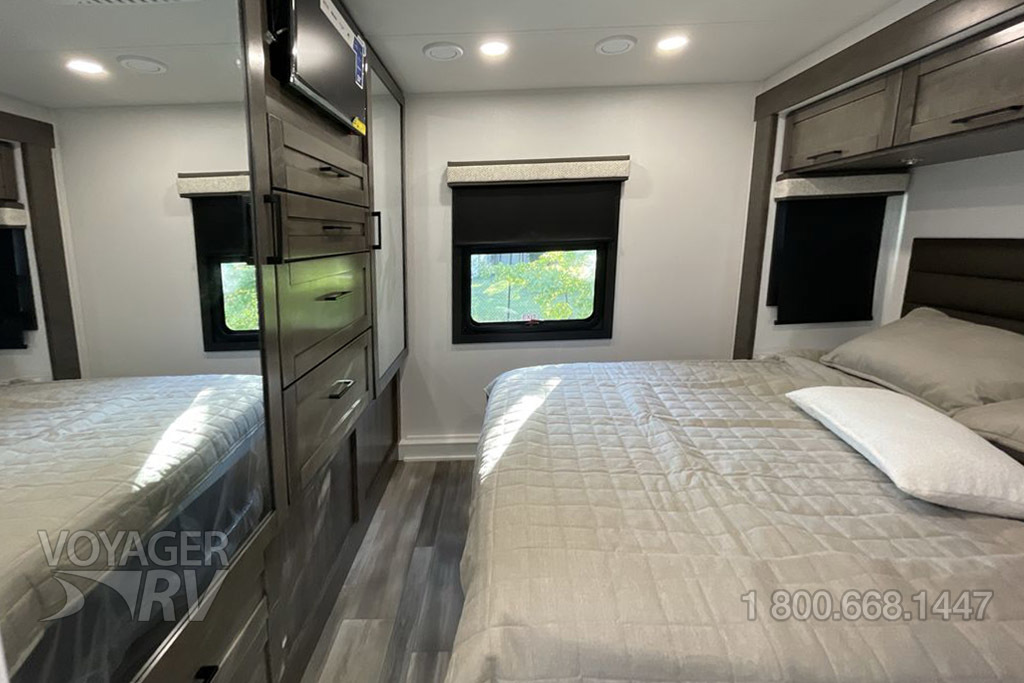 - Customer Value Package: JRide Plus: Computer-balanced driveshaft, Koni FSD shocks, heavy-duty rear stabilizer bar, standard front stabilizer bar, Hellwig helper springs, rubber isolation mounts. Automatic hydraulic leveling jacks, Frameless windows, Electric patio awning with LED lights, 15,000 BTU A/C with heat pump, 1,000W inverter, Sony infotainment center with tilt/swivel, Apple CarPlay and Android Auto, Backup and side-view cameras, LED HD Smart TV in living area.