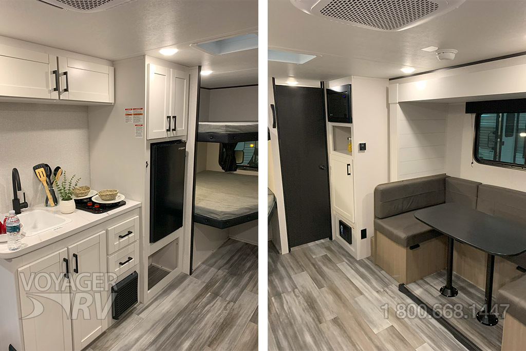 - Customer Value Package: 12V Refrigerator, 19k BTU Furnace, 2 Burner Stove Top, Bathroom Vent, Detachable Power Cord, Entry Door w/Window and Shade Prep, G20 Dark Tinted Privacy Windows, LED Interior and Exterior Lights, Microwave Oven, Stabilizer Jacks, Window Shades, Power Awning, Front Tongue Jack, Rear Bumper, 20# LP bottle, On-demand Tankless Water Heater.