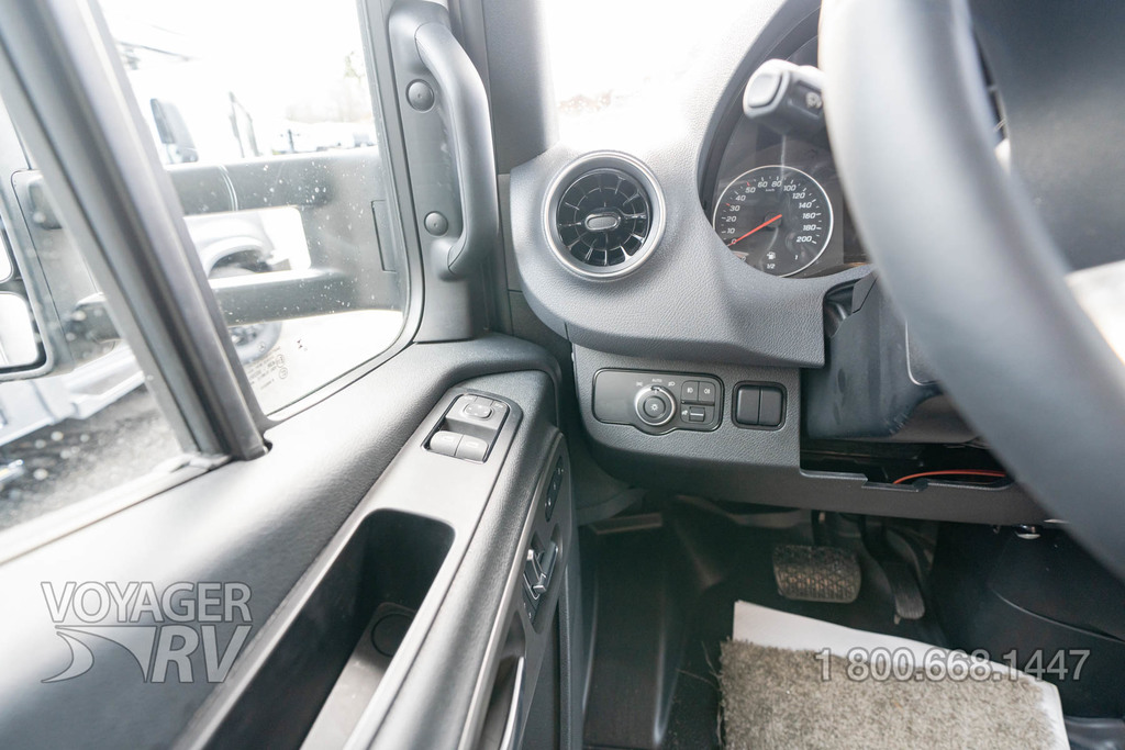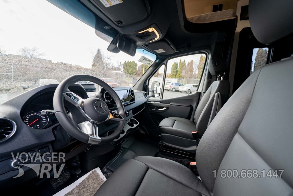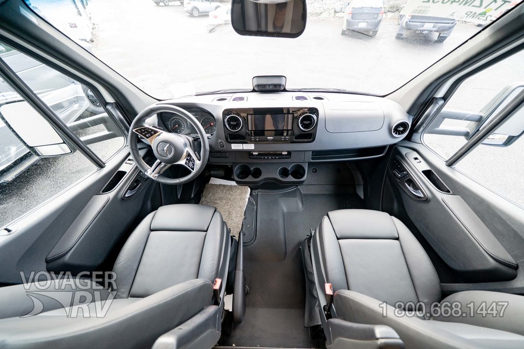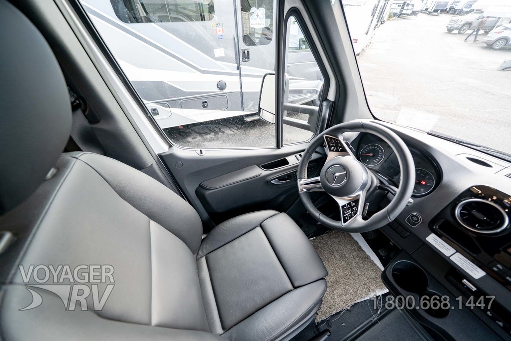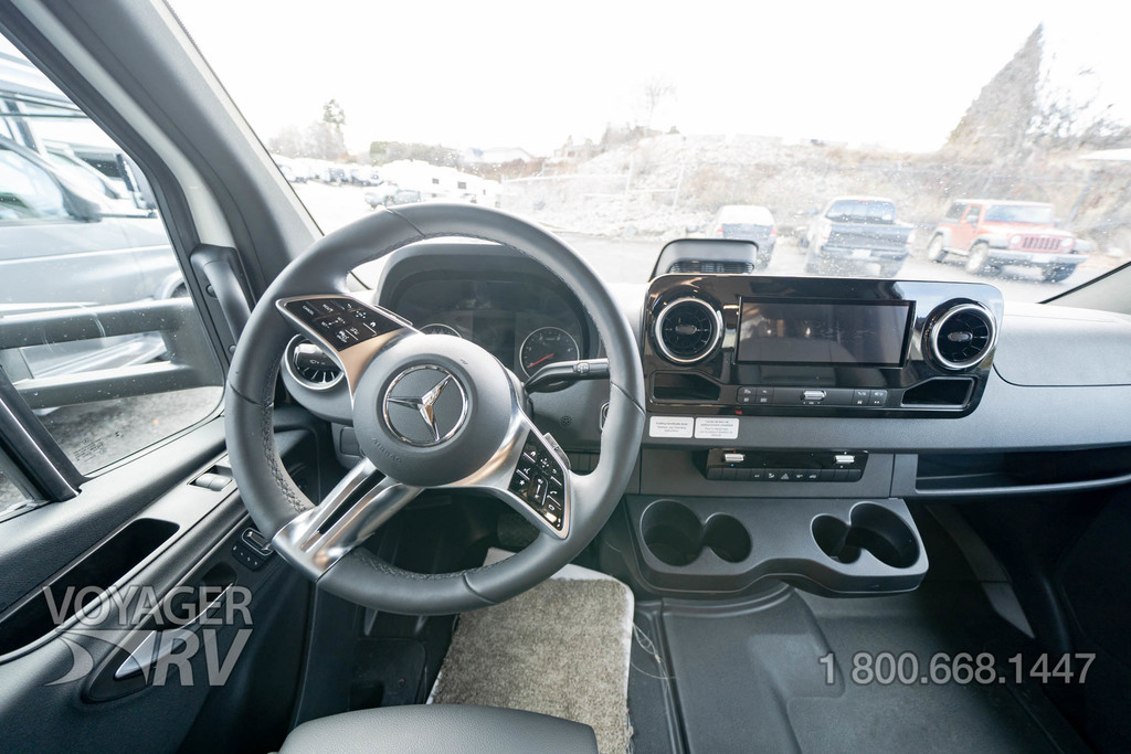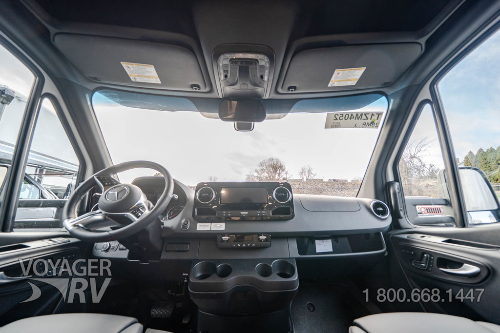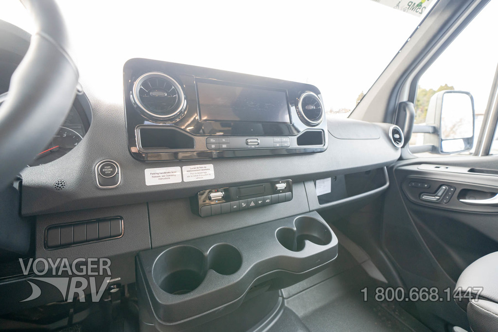 - Customer Value Package: One-piece, seamless, fiberglass front cap, Automotive-bonded, panoramic window in front cap with power shade, Frameless windows, 10.25-inch integrated Mercedes-Benz MBUX infotainment center with Apple CarPlay and Android Auto, Lippert 4000 series frameless windows, Electric stabilizer jacks, Girard armless patio awning with LED light strip, 1,000W inverter, Heated holding tanks (12V pads), Truma Combi D Comfort Plus diesel water heater and furnace, Backup and side-view cameras, Power, swivel, heated leatherette driver and passenger seats, Keyless cab entry.