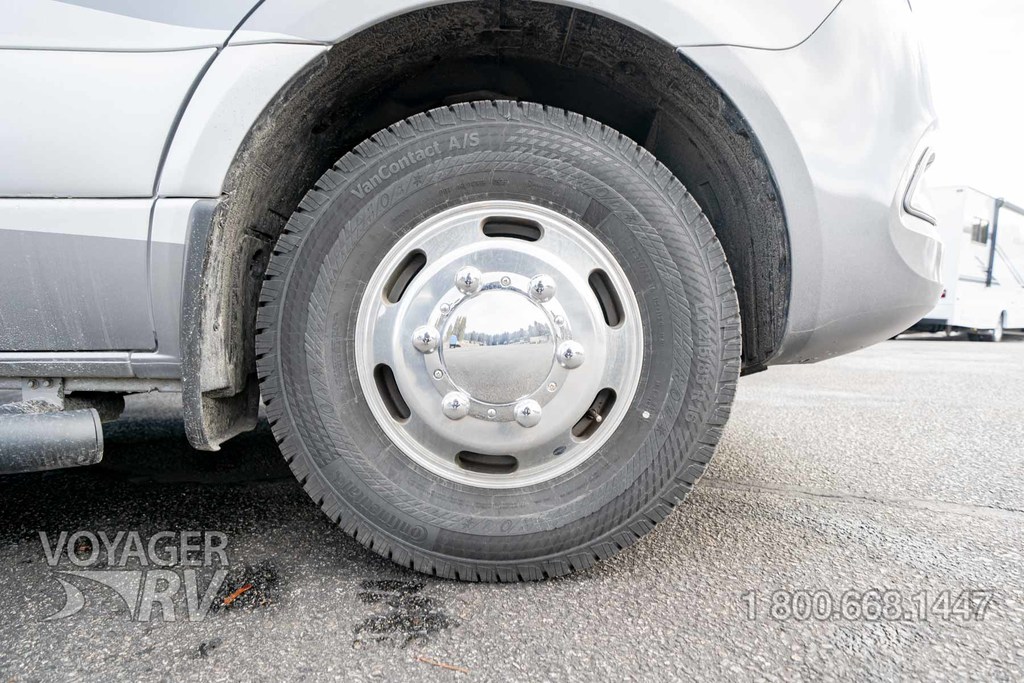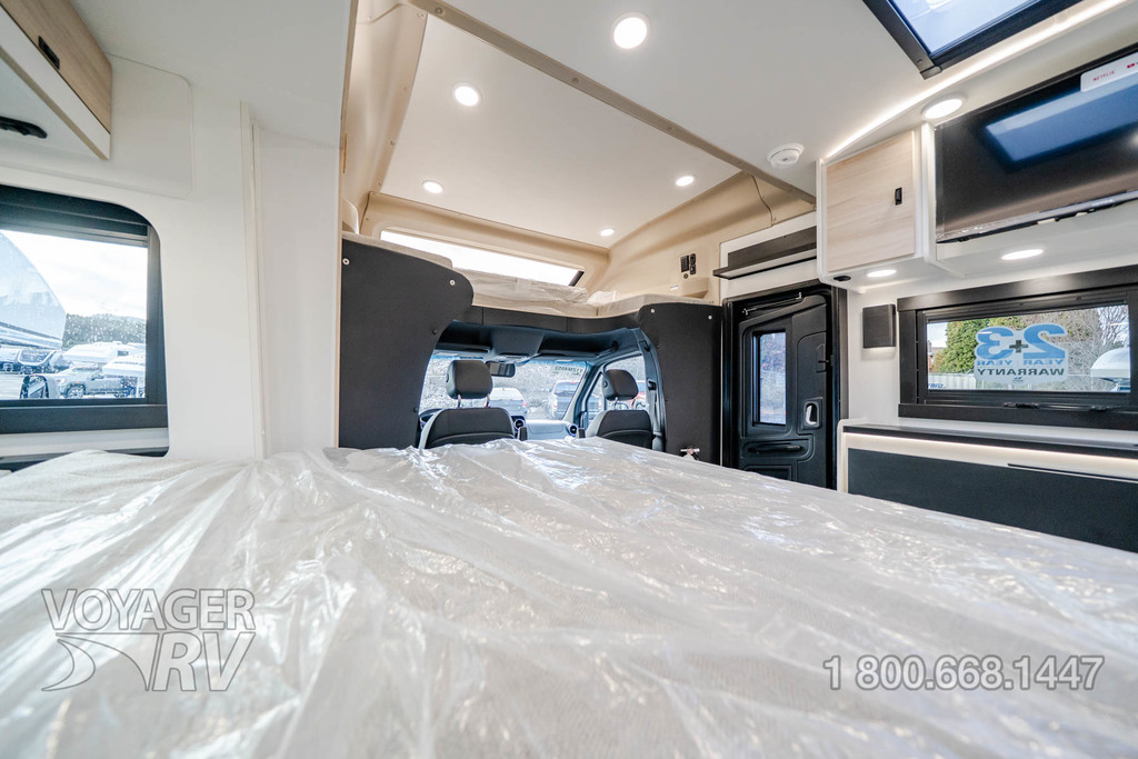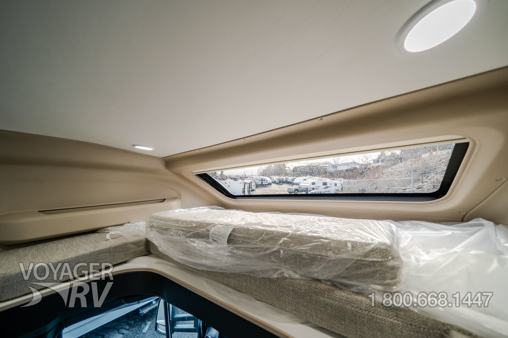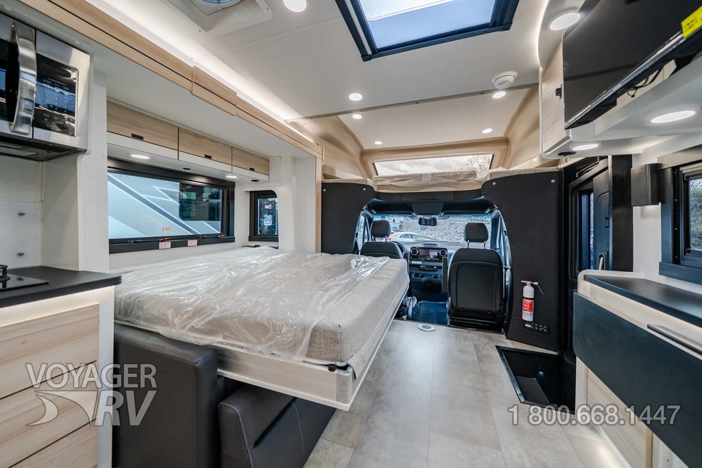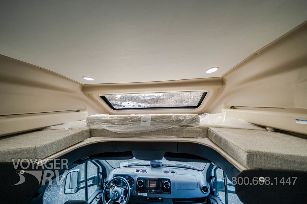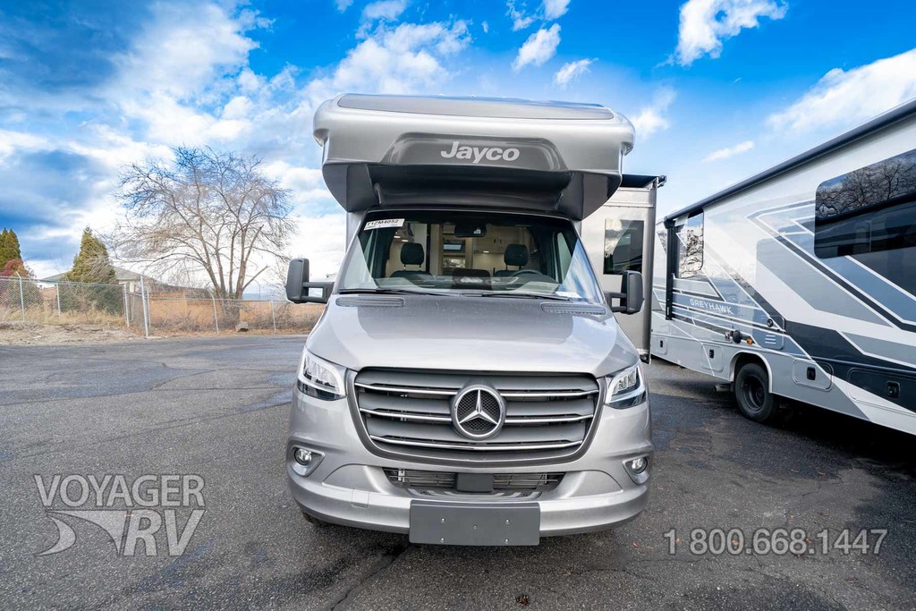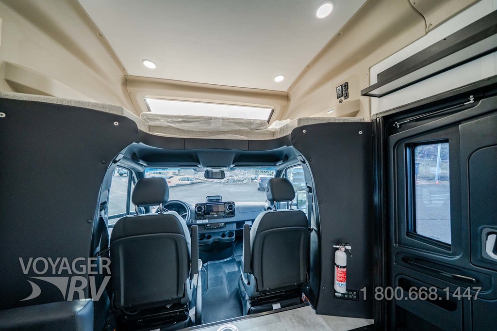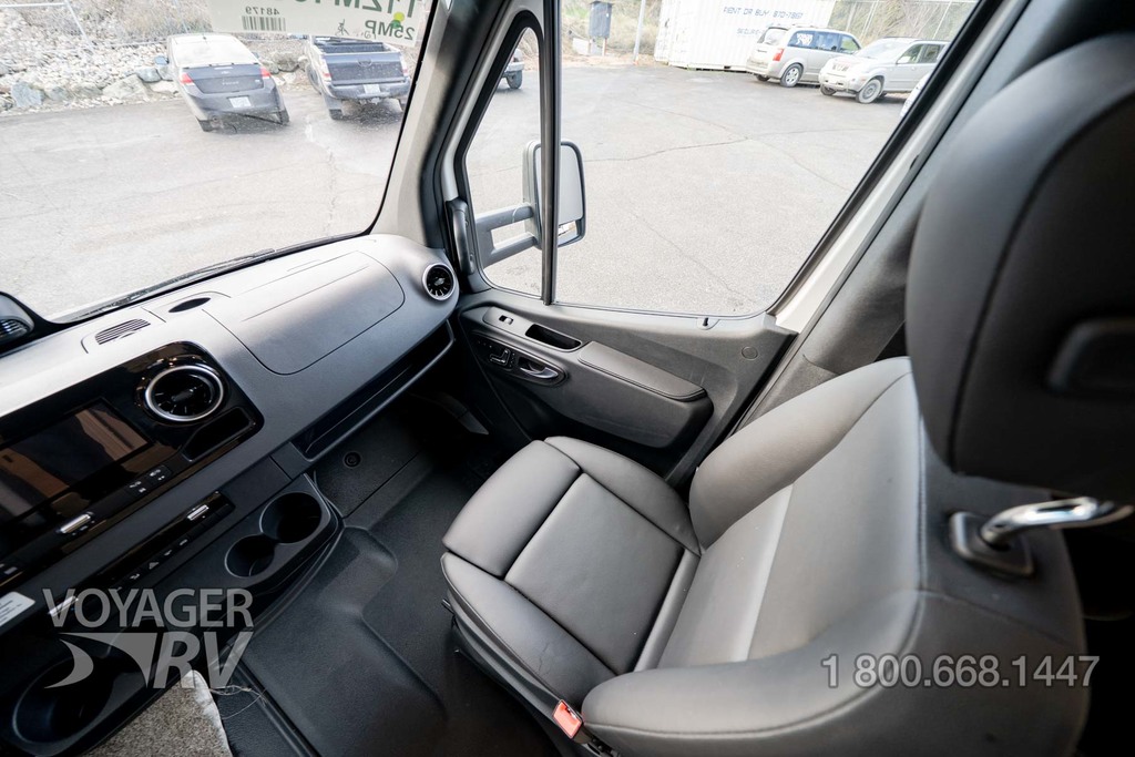 - Customer Value Package: One-piece, seamless, fiberglass front cap, Automotive-bonded, panoramic window in front cap with power shade, Frameless windows, 10.25-inch integrated Mercedes-Benz MBUX infotainment center with Apple CarPlay and Android Auto, Lippert 4000 series frameless windows, Electric stabilizer jacks, Girard armless patio awning with LED light strip, 1,000W inverter, Heated holding tanks (12V pads), Truma Combi D Comfort Plus diesel water heater and furnace, Backup and side-view cameras, Power, swivel, heated leatherette driver and passenger seats, Keyless cab entry.