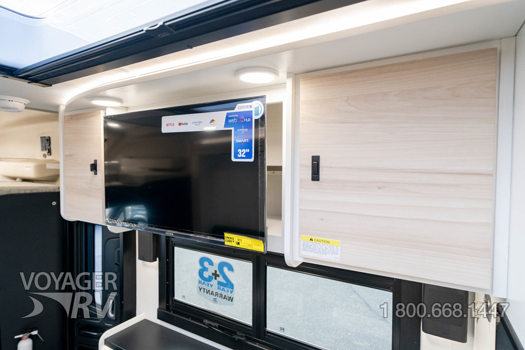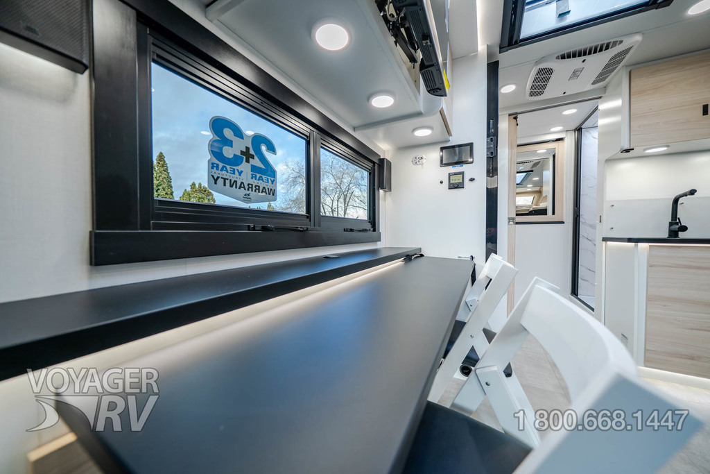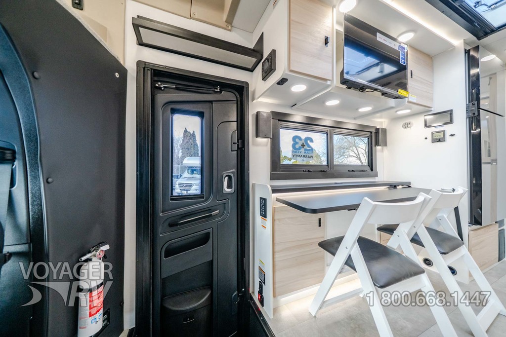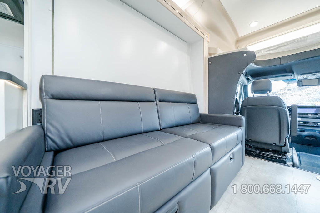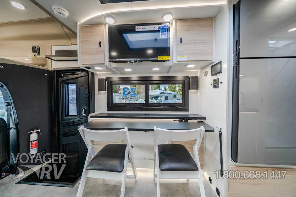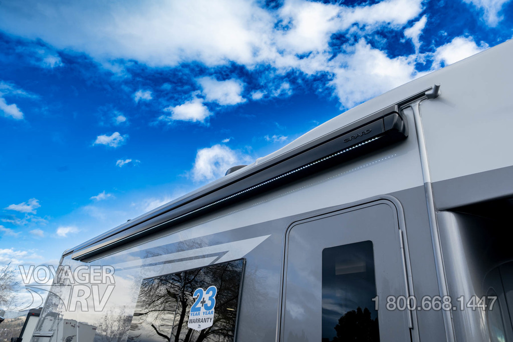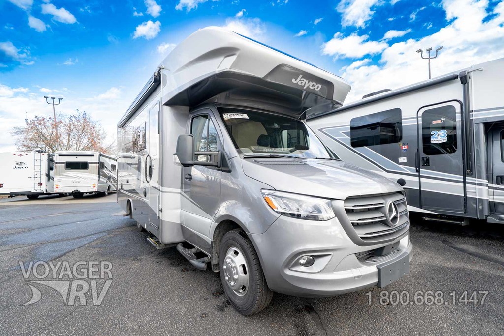 - Customer Value Package: One-piece, seamless, fiberglass front cap, Automotive-bonded, panoramic window in front cap with power shade, Frameless windows, 10.25-inch integrated Mercedes-Benz MBUX infotainment center with Apple CarPlay and Android Auto, Lippert 4000 series frameless windows, Electric stabilizer jacks, Girard armless patio awning with LED light strip, 1,000W inverter, Heated holding tanks (12V pads), Truma Combi D Comfort Plus diesel water heater and furnace, Backup and side-view cameras, Power, swivel, heated leatherette driver and passenger seats, Keyless cab entry.