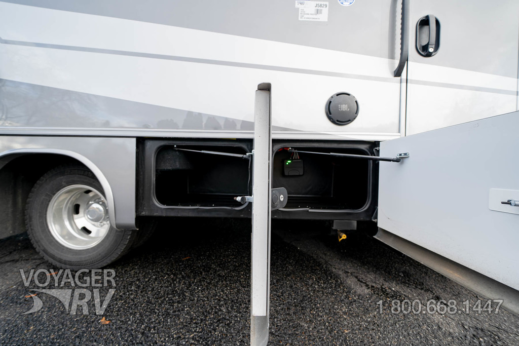- Electric-powered entrance step with integrated house battery compartment