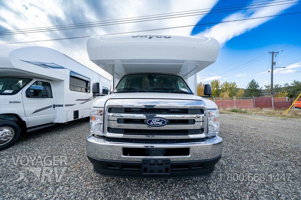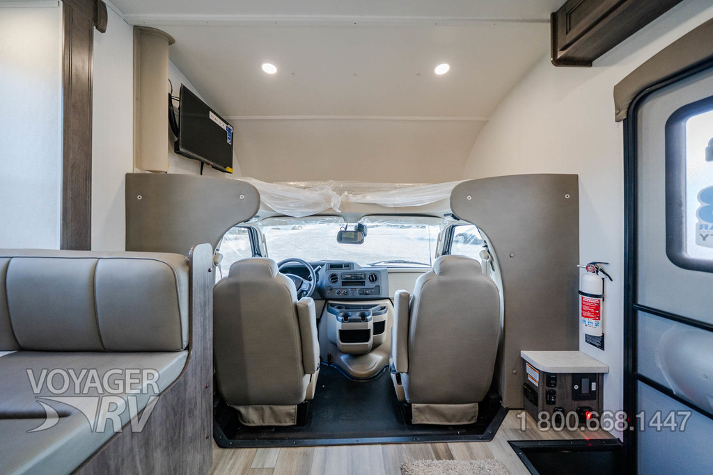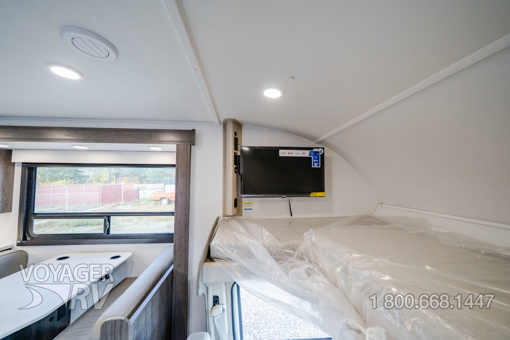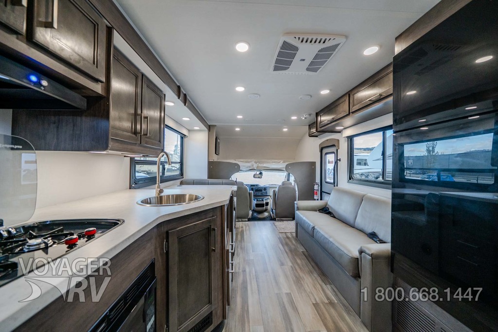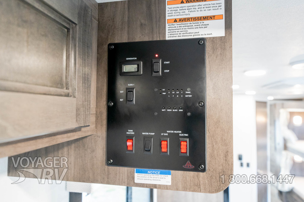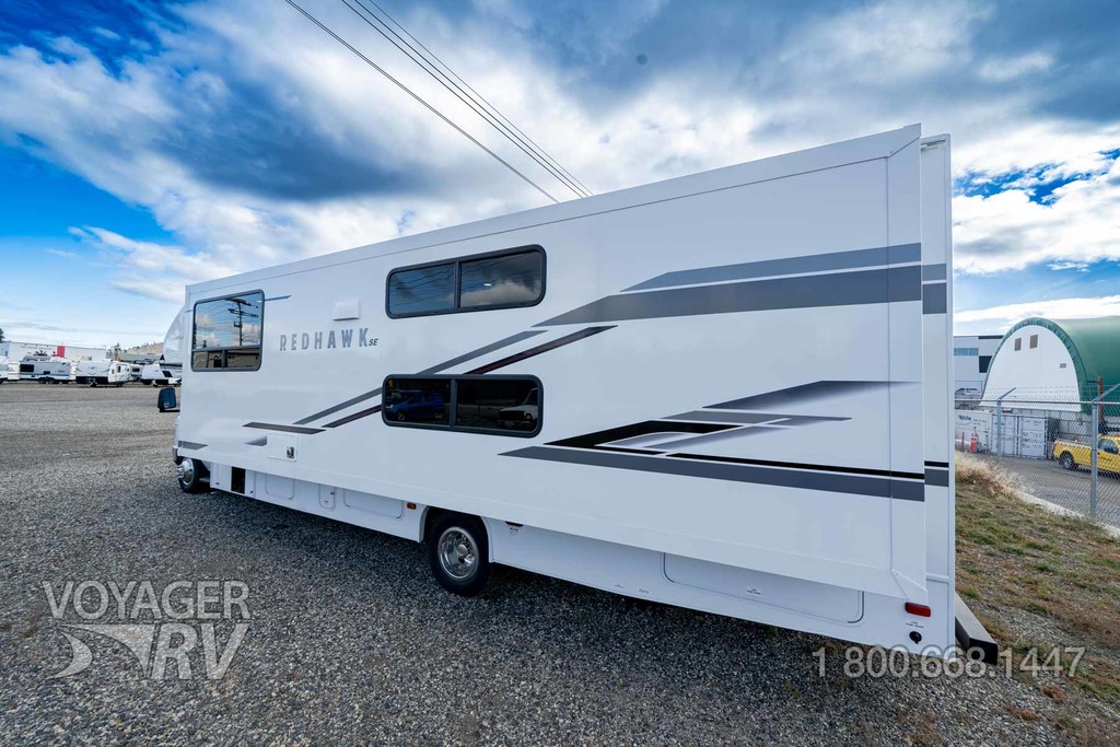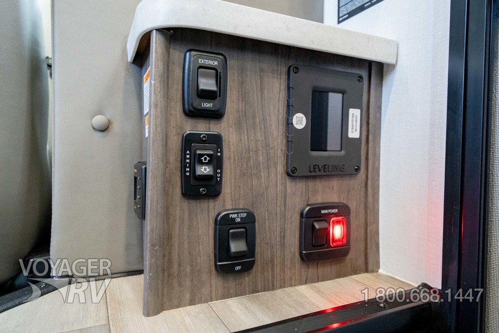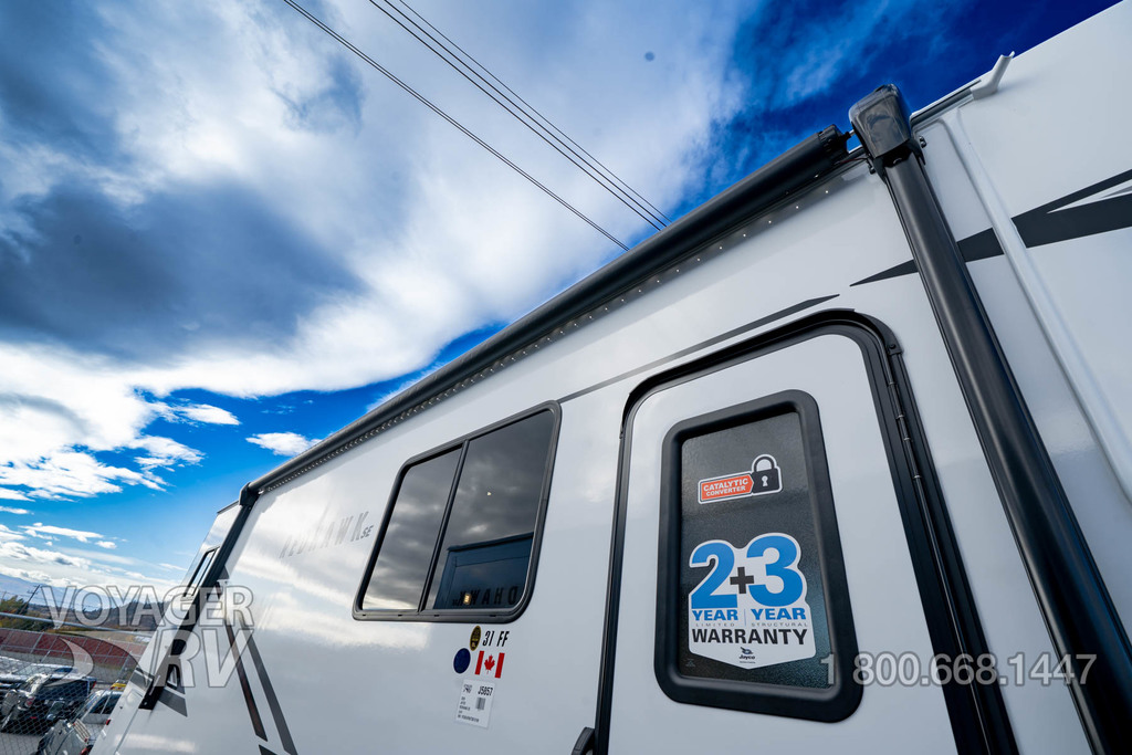 - Customer Value Package: One-piece, seamless, fiberglass front cap, Electric patio awning, Heated holding tanks (12V pads), Black holding tank sprayer, Backup camera, LED HD Smart TV.