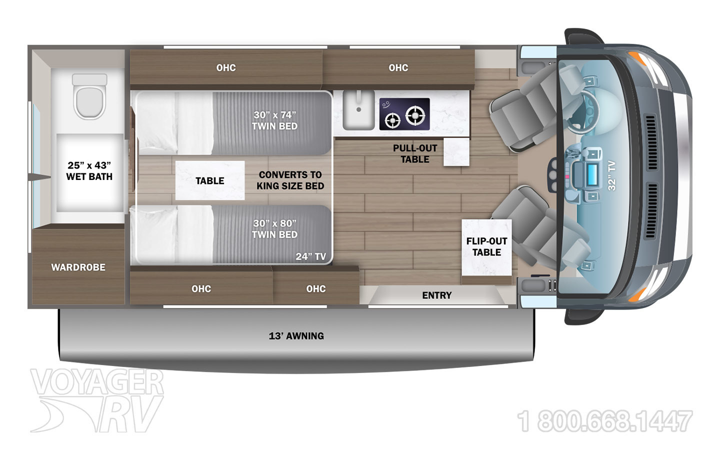 - (2) twin-size beds with filler cushion converts to king-size bed (20T)
