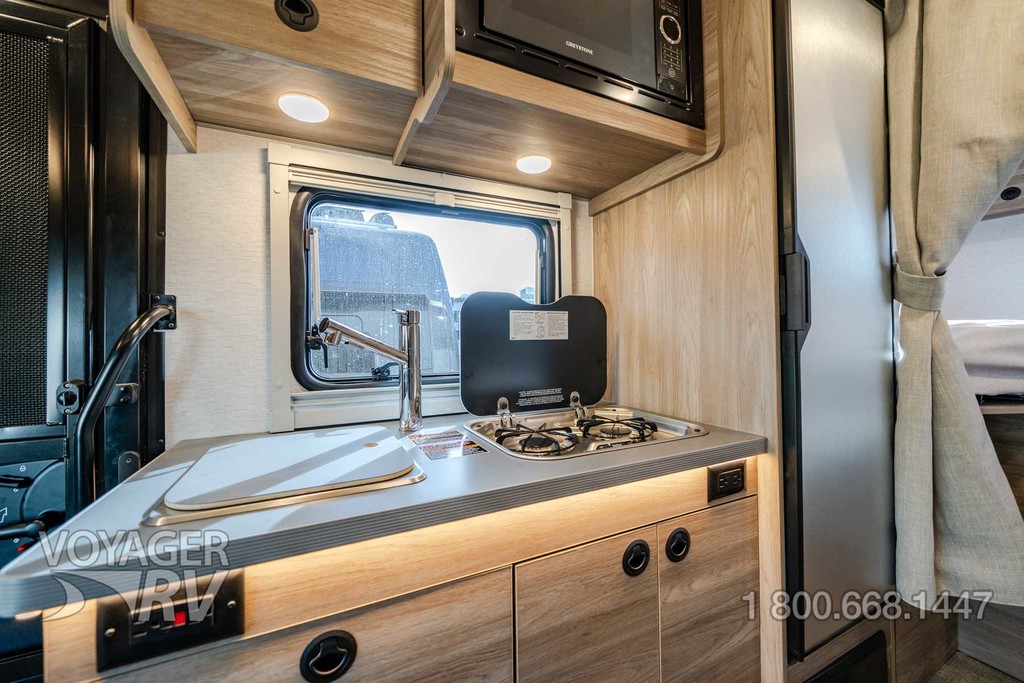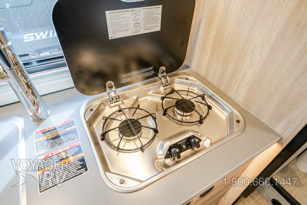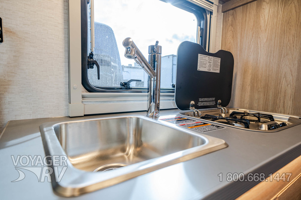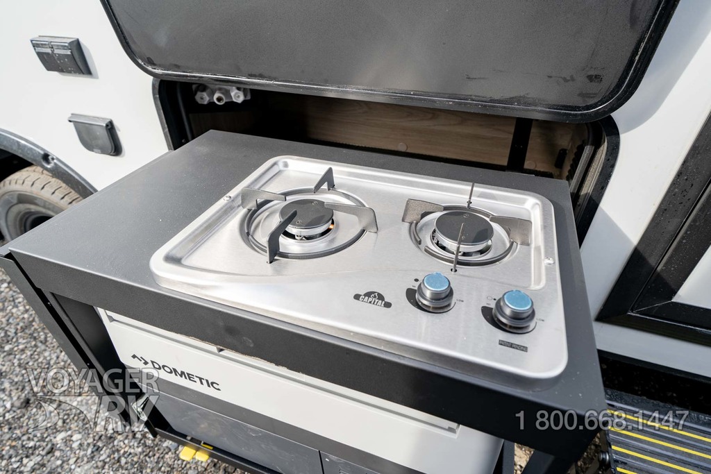 - Tailgate Package - Exterior kitchen w/chest style 12V refrigerator/freezer, 2-burner LP cooktop, flip-up counter extension, quick-connect faucet, collapsible sink, and LP quick-connect hose.