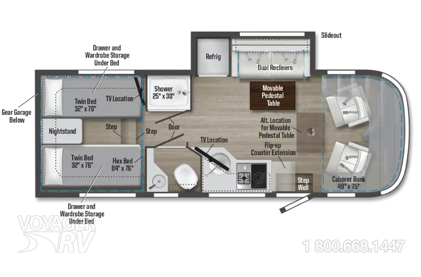 - Heated gear garage w/L-track cargo tie down system, 110V/12V charging ports, and LED lighting