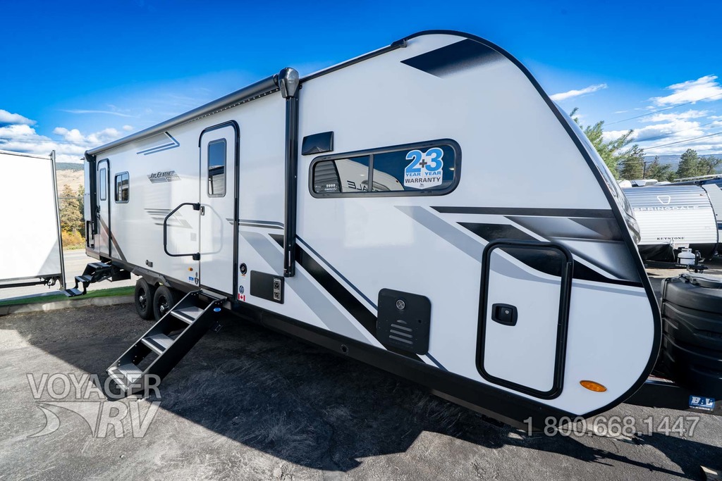 - JaySport Package: 11 Cu. Ft. 12V Refrigerator, App Monitored TPMS (compatible w/ most Apple Car Play & Android Auto), Climate Shield (Zero to 100 Degree Tested Weather Insulation Package), Front Slam-Latch Baggage Doors, Invision Kitchen Appliance Package, Solid Fold-Down Step w/ Aluminum Tread On Main Entry Door Step, LED Smart TV, Modern Graphics Package, Porcelain Foot-Flush Toilet, Overlander 1 Solar Package: (1) 200 Watt Solar Panel and 30-Amp Digital Controller, Stainless Steel Double Basin Kitchen Sink, Keyed Alike Doors, Rear Exterior Ladder, Dark Tinted Privacy Windows.